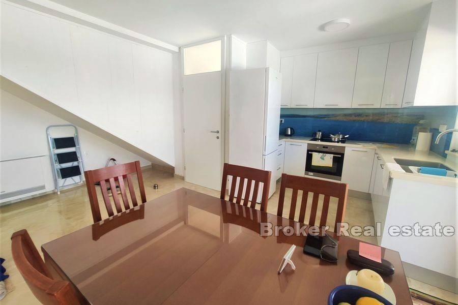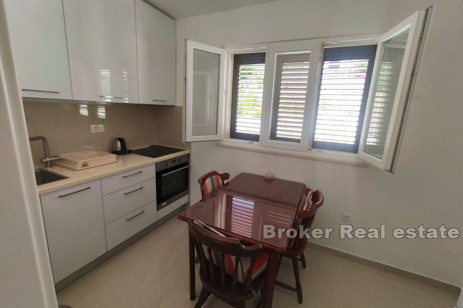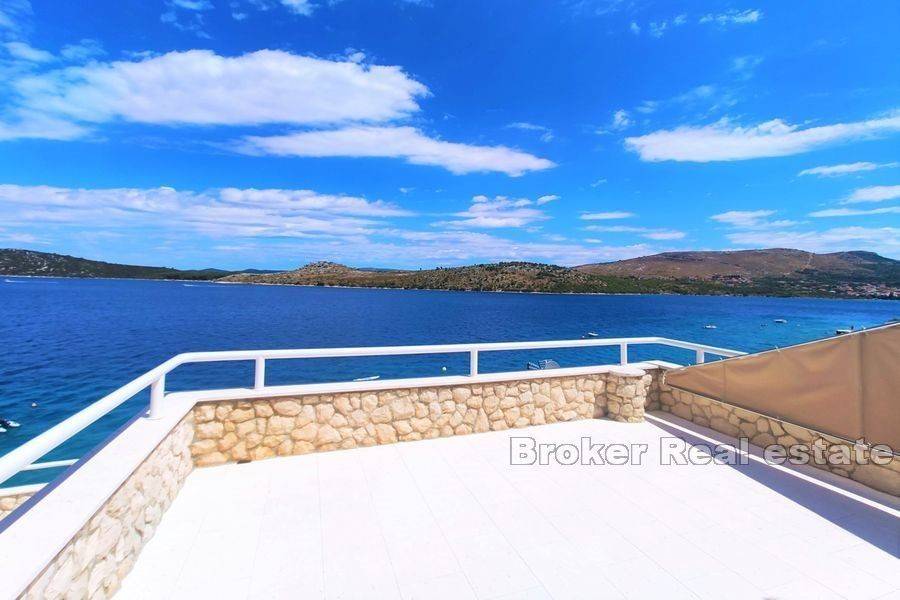 Charming house, first row by the sea. Located on a large plot of 600 m2, the property itself follows the landscape and spreads over 3 floors with its cascading architecture. On the first floor there is an apartment with a kitchen, living room, bedroom, bathroom and a large terrace. Next to the entrance there is also a small storage room. External stairs connect the entire plot, from the main entrance all the way to the beach, which is only a few meters from the property. On the first floor there is a fully equipped apartment with a kitchen, bedroom, living room and exit to another terrace. Internal stairs lead to the second floor where there are 3 bedrooms, a large terrace with a panoramic view of the sea and the countryside. There is also a smaller entrance to the attic of the house in the corridor. On the north side is an external building with the possibility of expansion. The entire plot is for construction and offers various possibilities. The spacious yard ensures privacy and peace. Positioned not far from Primošten and the city of Šibenik, which are only a few kilometers north of the property. Away from the noise of the road and the city, it is extremely safe for children and pets. Shops and the town center are located 100 m from the house, so it is suitable for living all year round. Due to its attractive position, the building is a top choice as a summer home or for rental purposes due to its close proximity to the sea and all essential amenities.