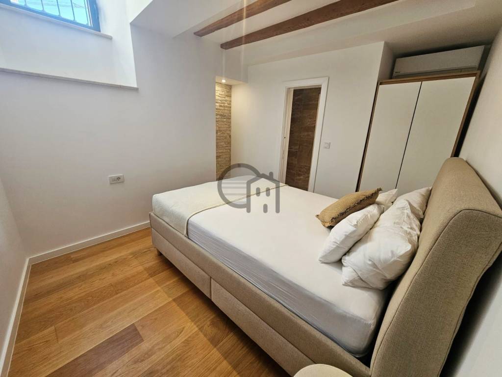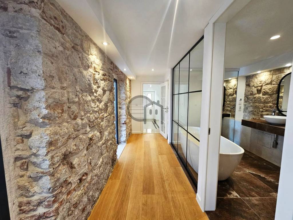 The floors are finished with high-quality oak parquet, and new wooden beams were installed during the renovation, enhancing both the structural integrity and the authentic character of the space.