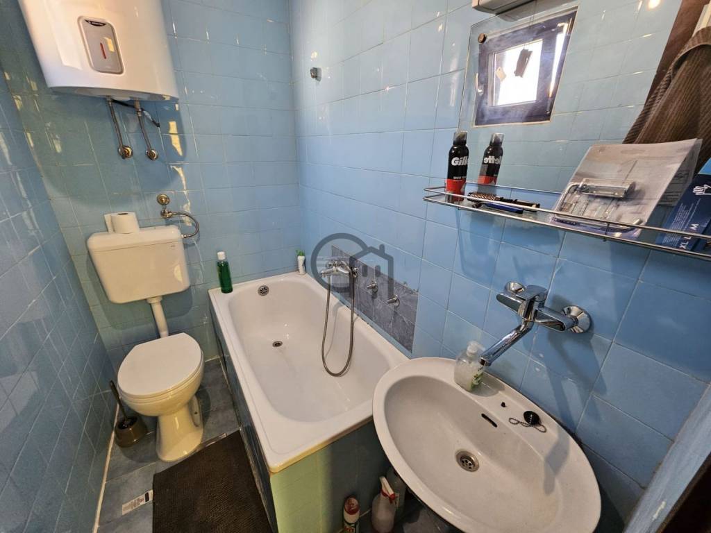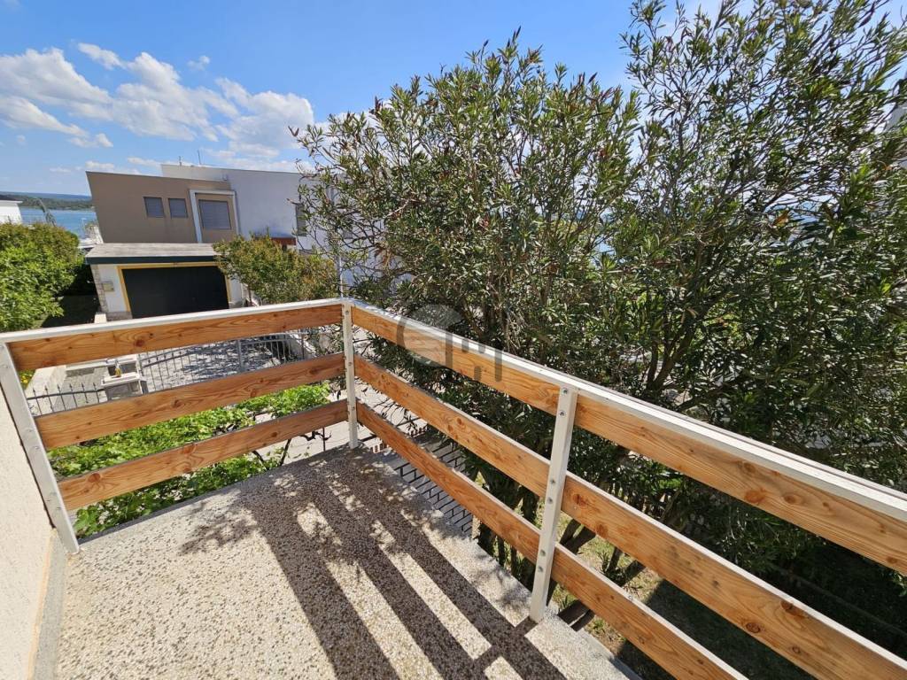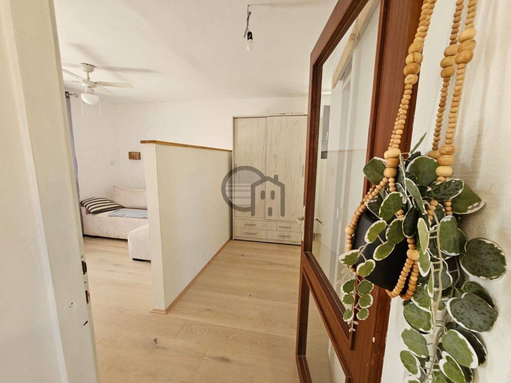 The house sits on a 277 m² plot and spans two floors, each measuring 50 m². The ground floor features a functional kitchen with a dining area, a cozy living room, a bathroom, and a spacious terrace ideal for relaxation and gatherings. An external staircase leads to the upper floor, which includes a hallway, another bathroom, and three bedrooms, two of which have access to a balcony with a partial sea view.