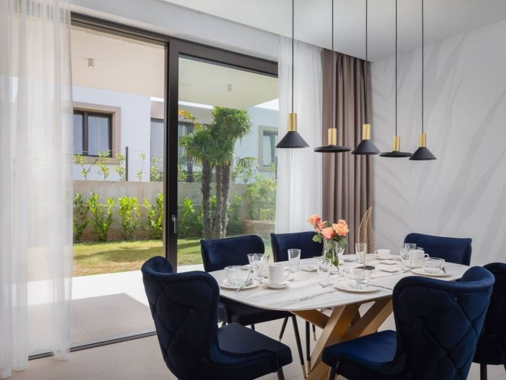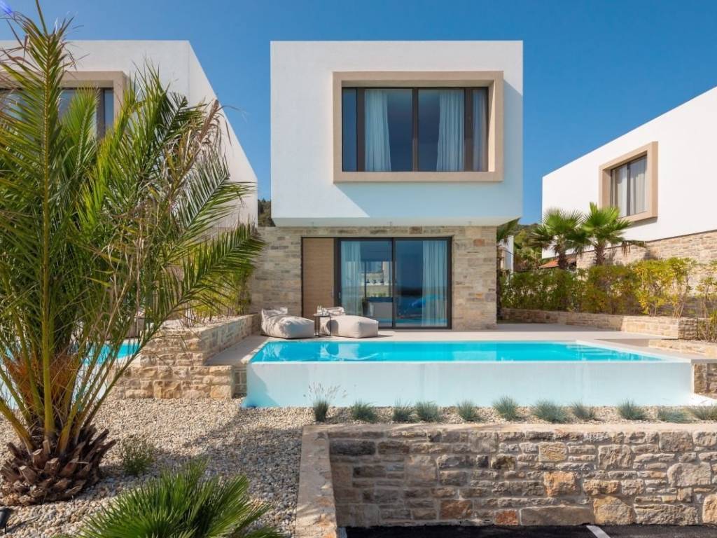 A beautiful villa located on the island of Pašman, which a combination of comfort, privacy and peace. This beautiful villa, located first row to the sea, with its design ensures a top-notch stay. Surrounded by other villas within the resort, nature, and clear sea, the location exudes peace and privacy. High-quality materials were used in the construction of the property, while additional security is provided by security doors, underfloor heating… Also an additional advantage of the property, due to its location within the resort, future owners have the right to use all the resort’s services. From the swimming pool located in the immediate vicinity of the beach, to the water park that will be set up in the summer months in front of the resort… The resort also has a reception area that ensures privacy, as well as a restaurant. The villa covers approximately 156m2 of living space, while the plot area occupies 301m2. The property is distributed over two floors – ground floor and first floor. The ground floor consists of an entrance hall leading to an open living room with a kitchen and dining area, and a toilet. The living room has direct access to a beautiful terrace with a swimming pool, a sunbathing area, and a green area. The property also has a courtyard located behind the property, and the dining room leads to the courtyard. Internal stairs lead to the first floor, where there are 3 beautifully decorated bedrooms that are air-conditioned. On the first floor there is a master bedroom with a bathroom, while the master bedroom offers a beautiful view of the sea and the islands surrounding the villa. In addition to the master bedroom, there are two more bedrooms on the first floor as well as a bathroom. Due to its location, the property is ideal for a quiet family life, as well as for tourist rental. All key amenities are nearby – shops, restaurants, and the ferry port that connects the island with the cities of Zadar and Biograd. The villa is being sold fully furnished, ready to move in and enjoy the unique Dalmatian ambiance.
