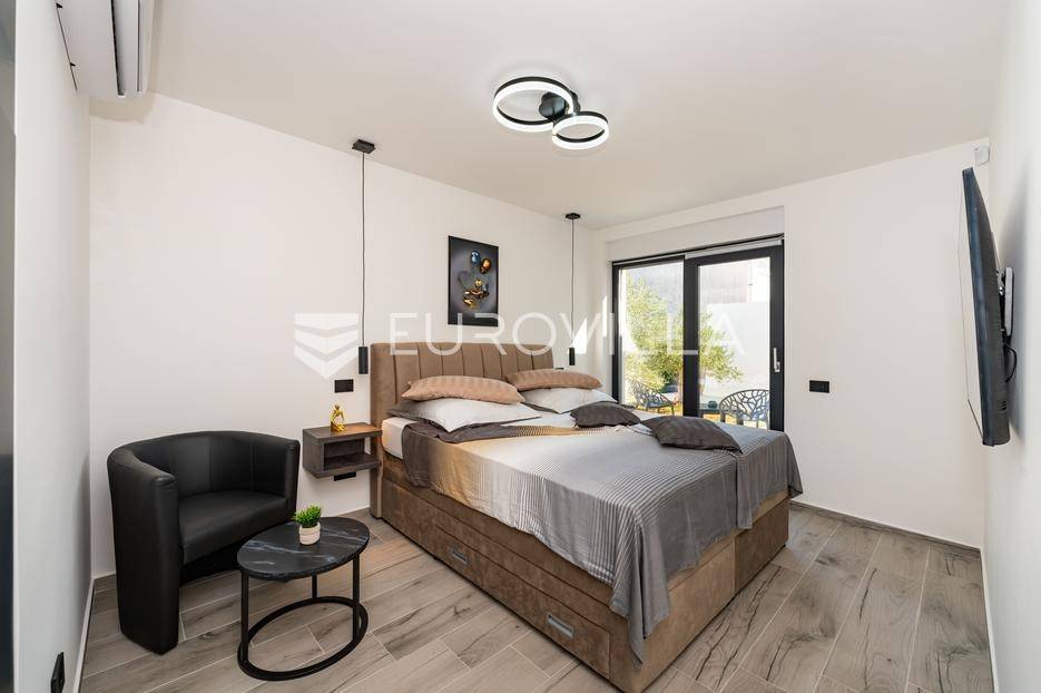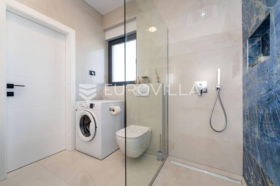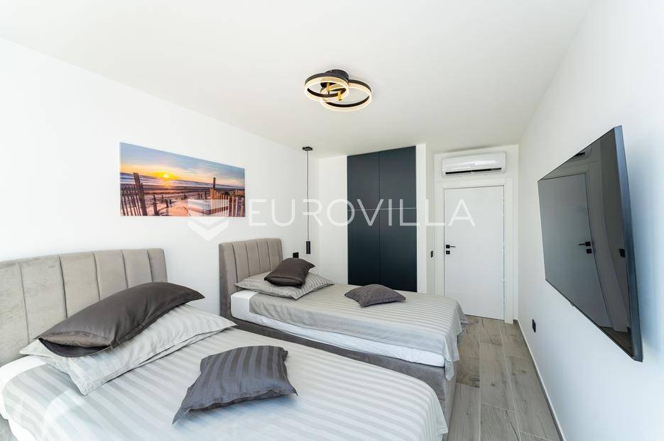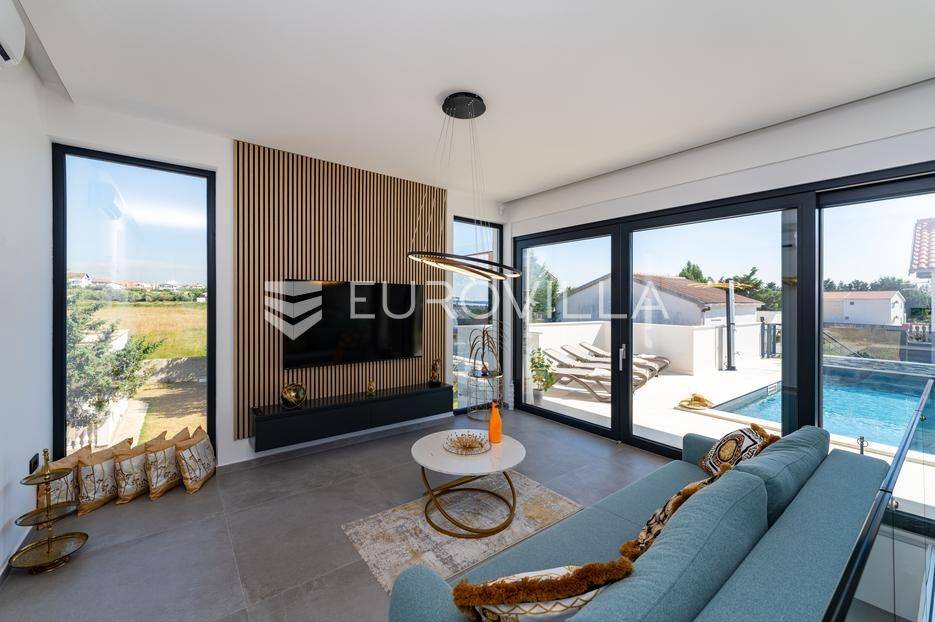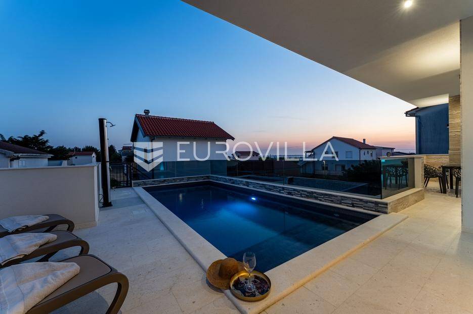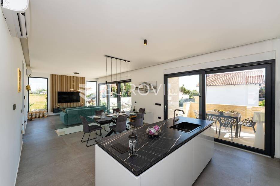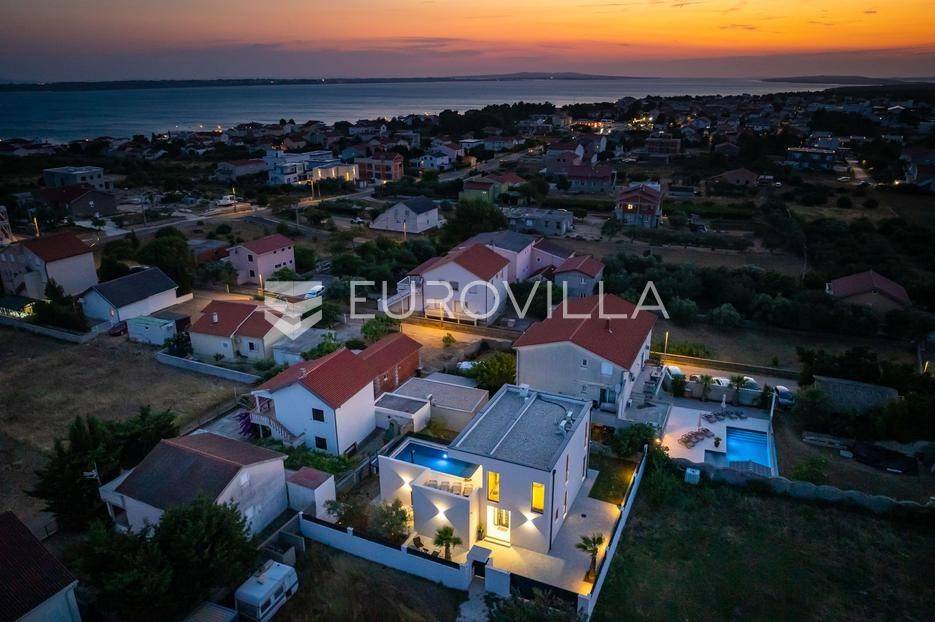 U mjestu Vrsi kraj Nina, 20 km udaljenosti od Zadra prodaje se predivna samostojeća dvoetažna vila ukupne neto površine 150 m2.U prizemlju se nalaze 3 prostrane spavaće sobe, 3 kupaonice i ostava, dok se u suterenu nalazi višenamjenska gospodarska prostorija.Na katu se nalazi prostrani otvoreni dnevni prostor koji uključuje kuhinju, blagovaonicu, dnevni boravak a na vanjskoj prostranoj dijelom natkrivenoj terasi nalazi se mjesto za sjedenje, ugrađeni roštilj, toalet i grijani bazen od 21 m2.Pri gradnji kuće koristili su se vrhunski materijali a sama kuća se odlikuje vrhunskim interijerom.Sve prostorije imaju podno grijanje, troslojna stakla, električne rolete, klima uređaj.Kuća se nalazi na zemljištu površine 433 m2 a pripadaju joj 3 parking mjesta.Dodatne informacije - udaljenosti od važnijih lokacija:More: 1200 m / Plaža: 1200 m / Mjesto za brod: 1500 mKupovina: 900 m / restoran: 900 m / zračna luka: 29 kmLjekarna: 2 km / Benzinska postaja: 5 km / Zadar: 22 kmNaravno, za sva dodatna pitanja stojimo na raspolaganju.