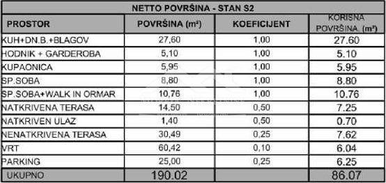 Residential unit S2 on the ground floor of a residential building, net area of ​​86.07 m/2. The apartment consists of: entrance hall with wardrobe, kitchen with living room and dining room, bathroom, two bedrooms, one of which has a walk-in closet. From the living room there is access to a partially covered terrace of 45 m/2. The apartment has a garden of 60.42 m/2 and two parking spaces.