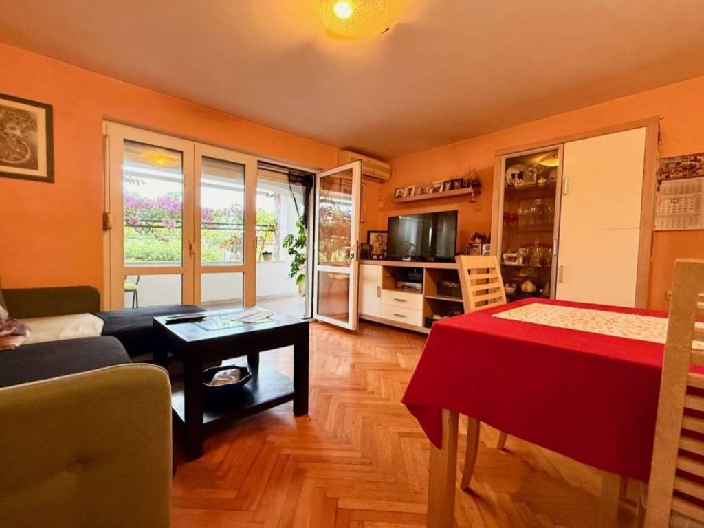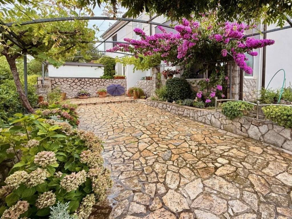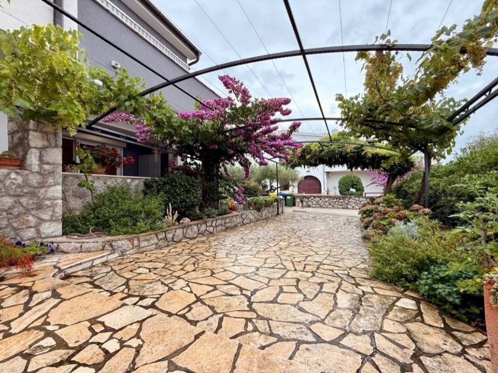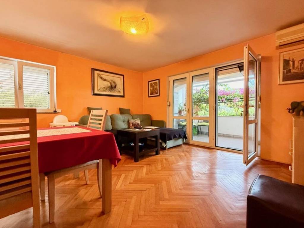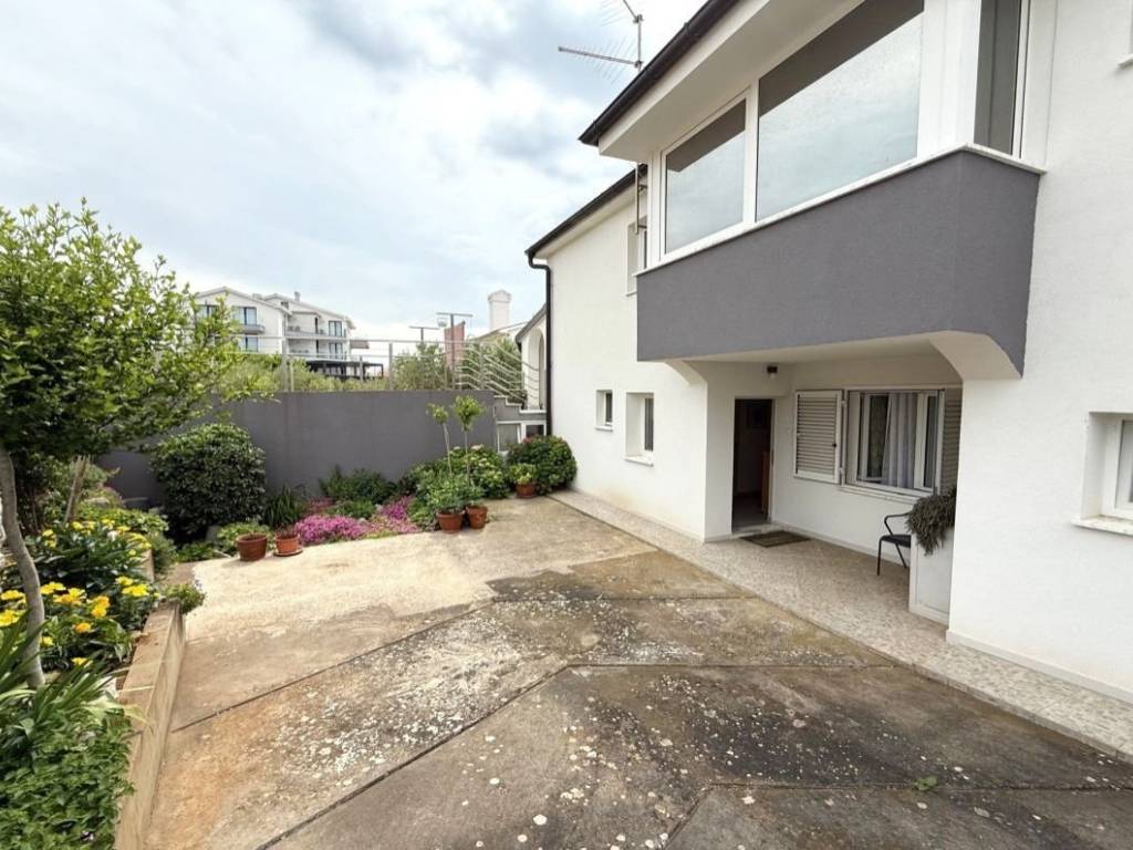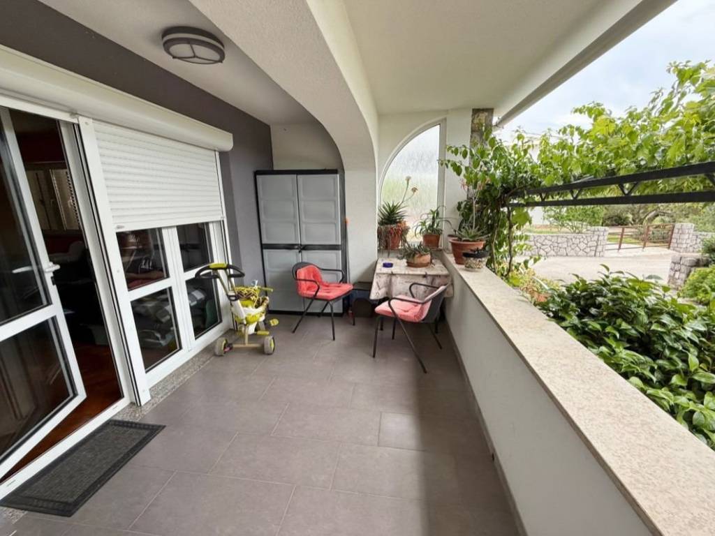 Otok Krk, grad Krk, prodaja apartmana površine 69,40 m2, u prizemlju apartmanske zgrade s uređenom okućnicom površine 132 m2. Apartman se sastoji od dvije spavaće sobe, dnevne sobe s kuhinjom i blagovaonom, kupaonice, hodnika i loggie od 12,50 m2. ALU stolarija s griljama, klimatizacija, parkirno mjesto. Mirna lokacija, 500 m do plaže.