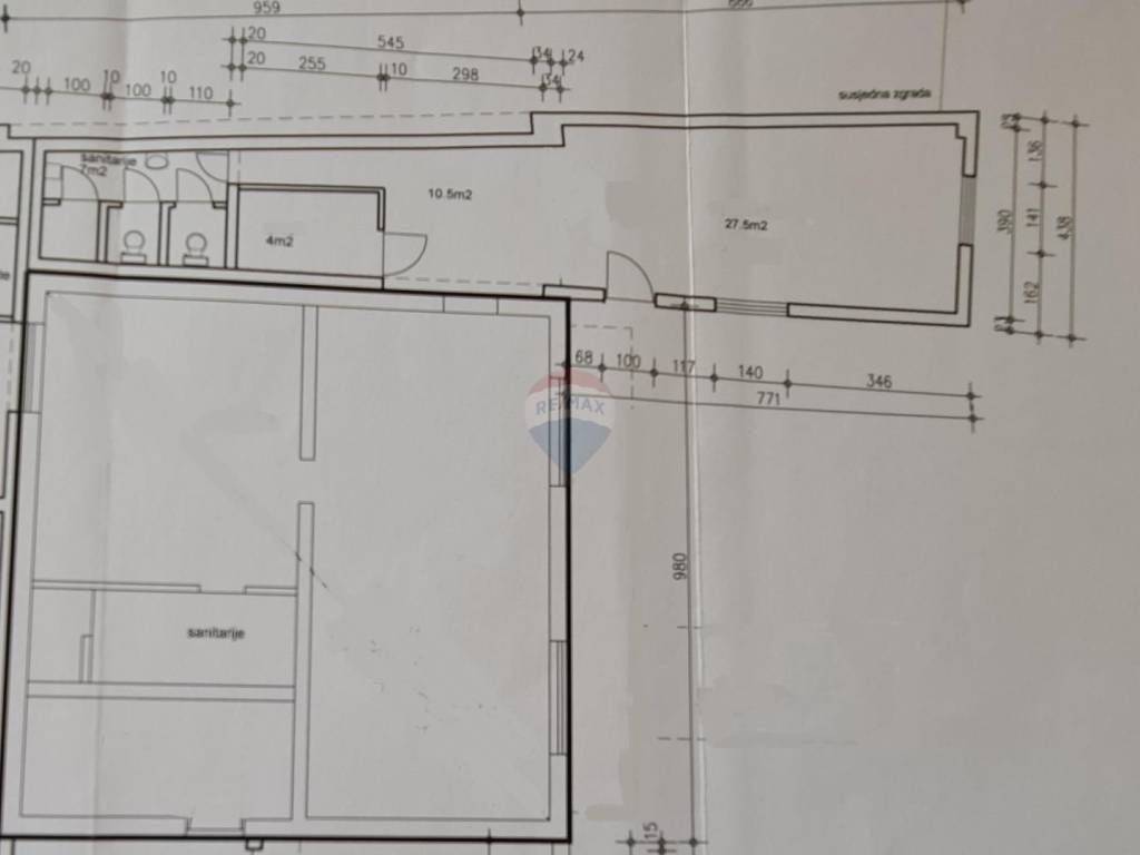 Manju cjelinu čini izduženi uredski prostor 3.5m x 8m, sanitarni čvor i ostava.