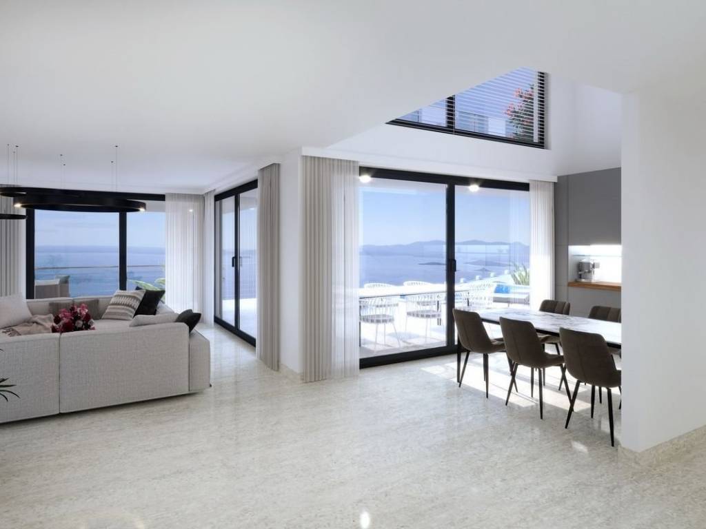 Peninsula, surrounded by unspoiled nature, bathed in sunlight, and offering breathtaking views of the islands of Mljet, Korčula, and Lastovo – this unique villa is a true oasis of peace and luxury. This impressive property offers 337 m² of living space on a 390 m² plot, perfectly integrated into the surroundings and designed to meet the highest standards of modern living. The villa spans several levels connected by an elegant internal staircase. A spacious living room with kitchen and dining area opens onto a covered terrace with stunning panoramic sea views. Three