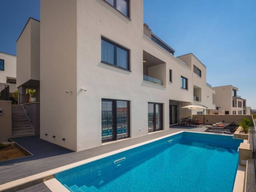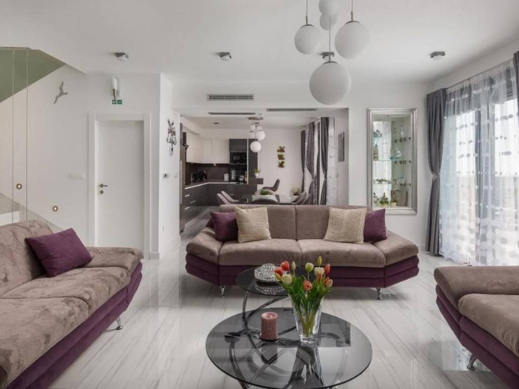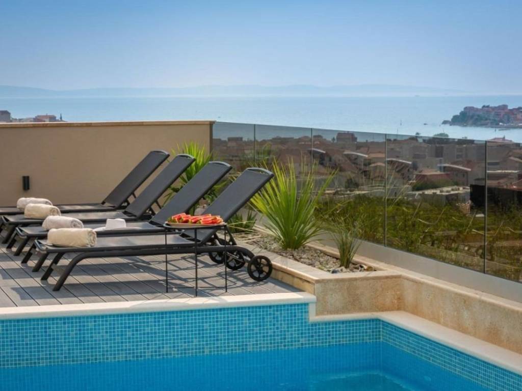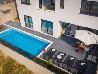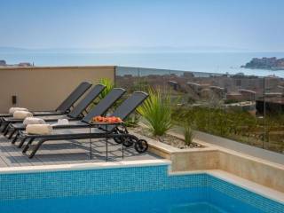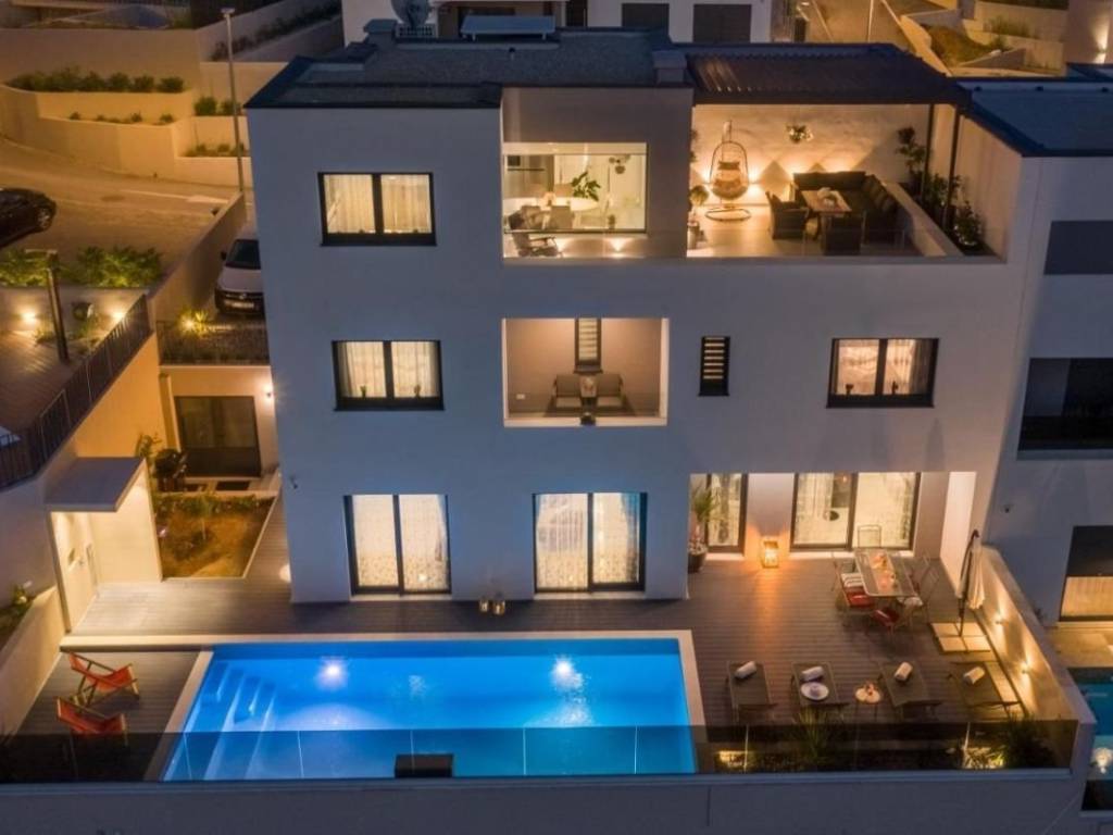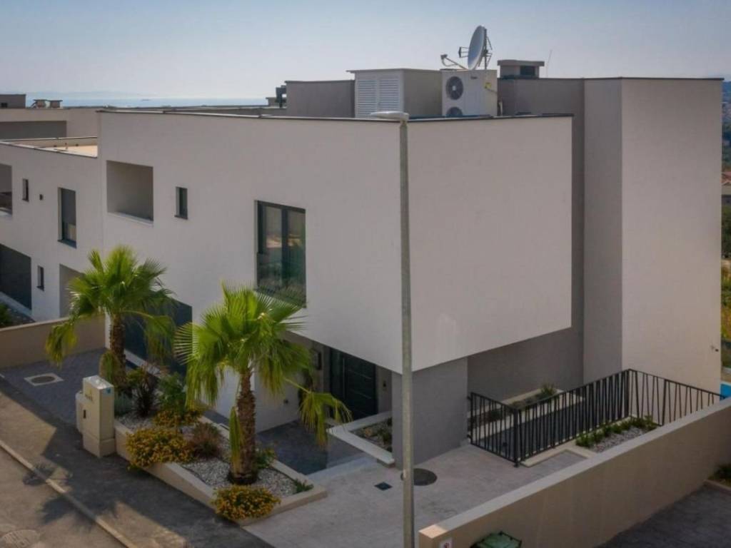 An exclusive villa with panoramic views of the crystal-clear sea is available for rent, located near Split. Positioned on the southern side, it exudes ultimate comfort, a modern interior, and elegant design. The villa offers a refined and contemporary ambiance with a unique view of the Mediterranean coast. With meticulous attention to detail, modern technical equipment, top-quality construction materials, and a touch of glamour, this villa provides a luxurious retreat for any family. It is spread over three floors.   The villa consists of a living room and kitchen, 4 spacious bedrooms, 4 bathrooms, a swimming pool, and high-quality garden furniture with a barbecue for preparing gourmet meals. It also offers private parking, a balcony, and both open and partially covered terraces.   The ground floor features a large living room perfect for evening gatherings, a dining area, and a kitchen that opens onto a partially covered terrace—ideal for relaxing by the pool. A bathroom is also located on this level.   The first and second floors contain 4 bedrooms, each with an en-suite bathroom, and access to an outdoor terrace with a lounge area.   The villa is fully air-conditioned.   In front of the property, there is a private outdoor parking area and a garage, a heated pool with sea views, and premium garden furniture with a barbecue.   The property is rented fully equipped and furnished with high-quality interior and exterior elements, including household appliances, flat-screen TVs, LED lighting, an automatic cooling system, and more. The villa is available starting from mid-September 2025.   This unique property is an outstanding choice thanks to its southern orientation and Mediterranean climate, panoramic views of the pristine sea, modern architectural design, and its proximity to numerous sandy beaches. It is located just 9 km from the nearest major city, Split, and 30 km from Split Airport.