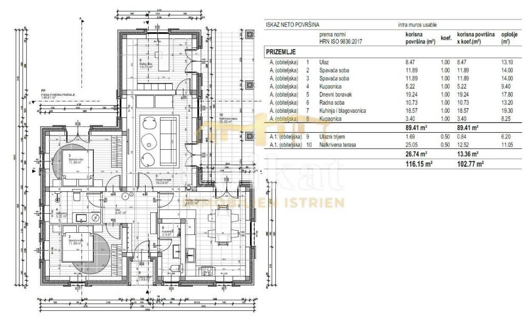 The house is one-story and consists of an entrance hall, kitchen with dining area, a separate living room, two bedrooms, one study and two bathrooms, one larger and one smaller. The study room is entered through the living room, and there is access to the covered terrace from the kitchen, living room and study room. Additionally, one bedroom has balcony doors to access the garden behind the house.