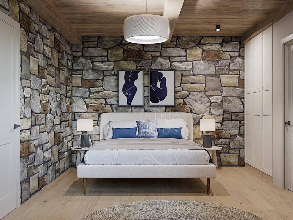 An autochthonous stone house for sale with a swimming pool decorated with top design, located in the vicinity of Poreč. The house has 183 m2 and extends over three floors and a wine cellar. On the ground floor there is a living room, kitchen, toilet, storage room, sauna and access to a beautifully landscaped yard with a swimming pool and lounge area. On the first floor there are two bedrooms, each with its own bathroom and access to a covered terrace with an open view. On the second floor there are two bedrooms, each with its own open space bathroom. The house is equipped with air conditioning and underfloor heating on the ground floor.