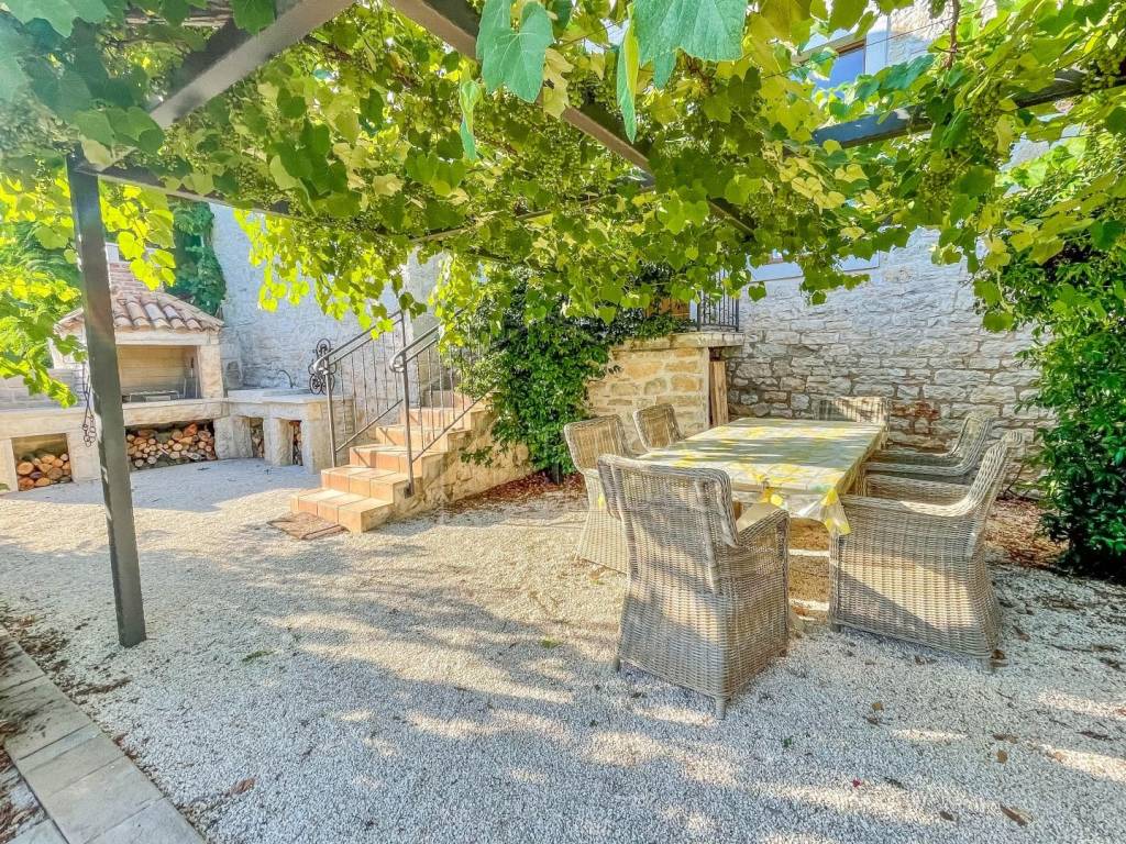 In the beautifully landscaped yard there are numerous fruit trees, olive trees, vines, Mediterranean plants and a swimming pool. There is also a summer kitchen in the yard, all in a traditional style. The yard is spacious, fenced, and the house has three parking spaces.