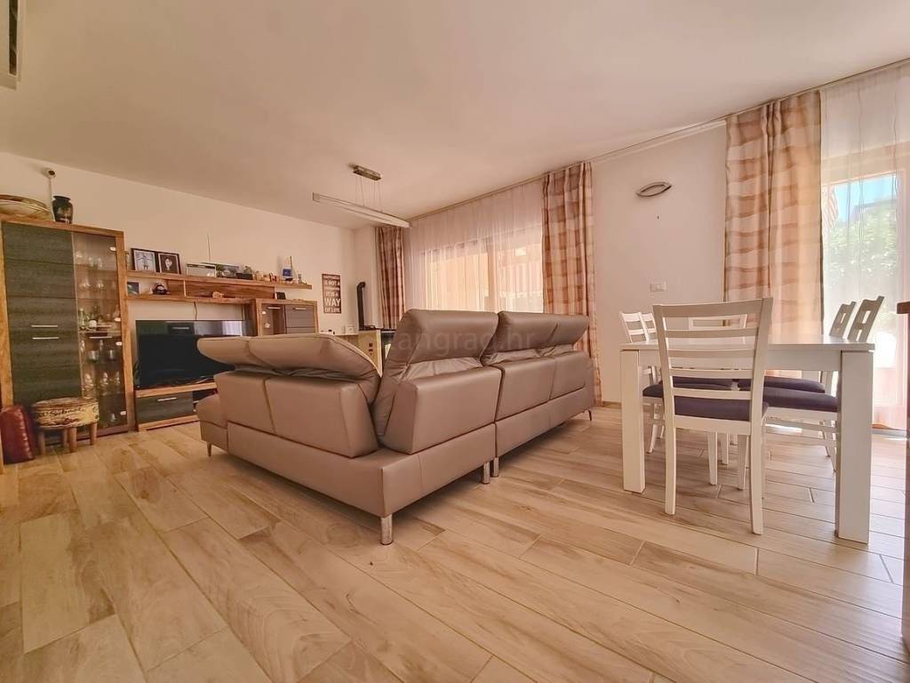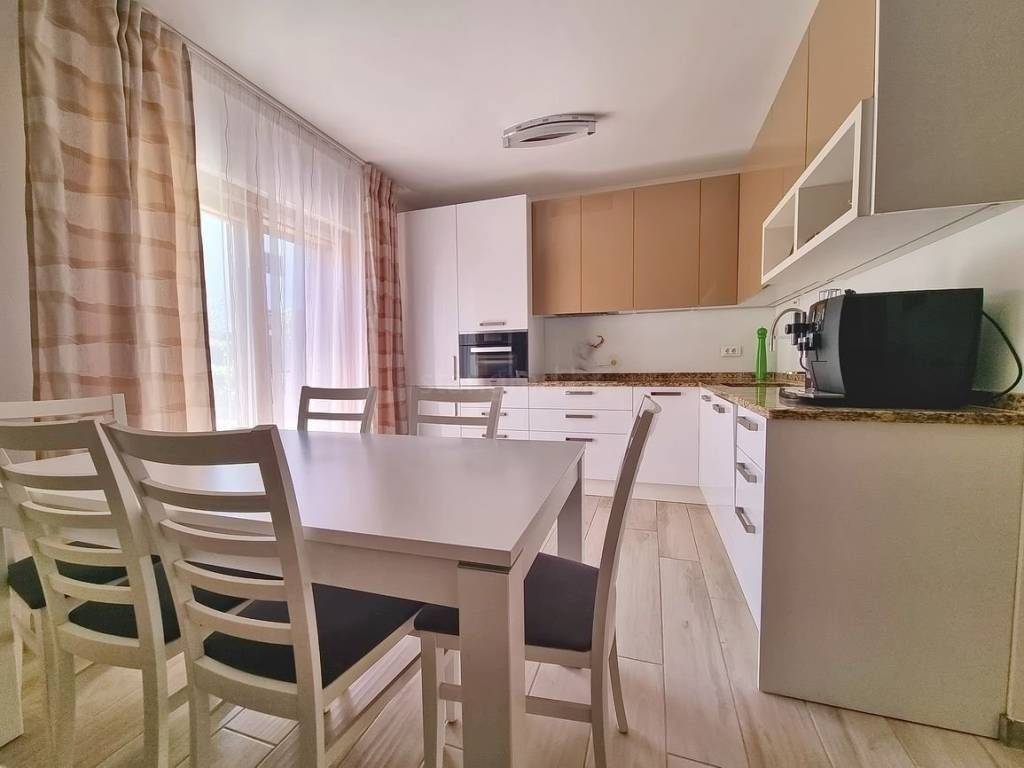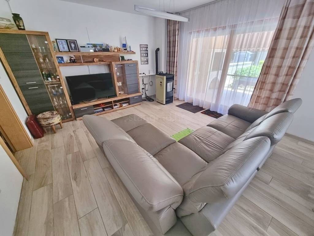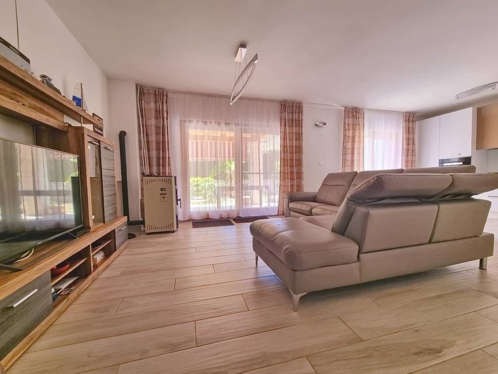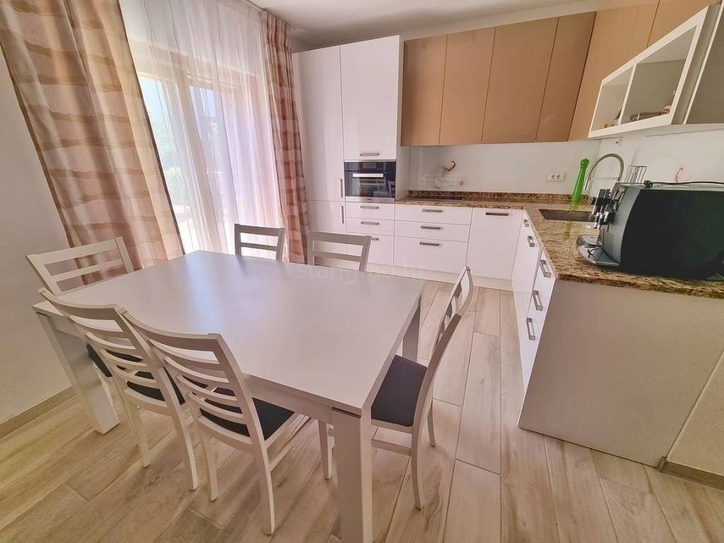 The total area of the house is 103 square meters, which includes an entrance hall, storage room, kitchen with dining area, living room, covered terrace, two bathrooms, and three bedrooms. The interior is exceptionally well maintained and furnished with luxurious and high-quality furniture as well as modern technical equipment, providing a comfortable and carefree stay.