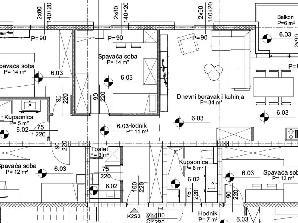 Stan S3 na II. katu ukupne kvadrature 97,5 m2 sa obračunatim koeficijentom sastoji se od ulaza, hodnika, tri spavaće sobe, kupaonice, wc-a, dnevnog boravka i kuhinje sa blagovaonom te balkona.
