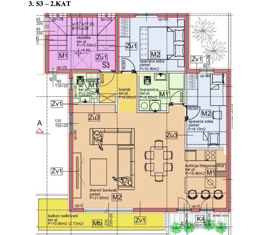 Kaštela Stari, B-S3 komforan dvosoban stan od 83,7 m2 smješten u novogradnji na 2. katu s pripadajućim parkirnim mjestom.Sastoji se od: komfornog dnevnoga boravka otvorenog tipa s kuhinjom i blagovaonicom dvije spavaće sobe, kupaonice, WC-a, hodnika balkona naslonjene stan.Zatvorena stambena površina 78,5 m2, dnevni boravak s blagovaonom i kuhinjom od 41,6 m2, tri sobe (površina 11 m2 i 9 m2), hodnik, kupaonica, gostinjski WC, te natkrivenog balkona od 11 m2.Stanu pripada ijedno parkirno mjesto ispred zgrade 13 m2, te je ukupna neto obračunska površina od 80,8 m2.Orijentacija stana: jug-zapad (obilje svjetla i sunca)Predviđeni završetak radova je 12/2026.g.Kvalitetna gradnja, konstrukcija od armiranog beton, pregradni zidovi kao i stropovi knauf s akustičnom vunom uz izvrsnu toplinsku izolaciju termo fasada, PVC zatvori, ravne podizno klizne stijenke, podovi s keramičke pločice i parket, podno grijanje u kupaonici, kompletno sanitarijama opremljena kupaonica.Za sve dodatne informacije stojimo vam na raspolaganju.