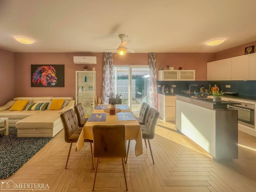 A single-storey house with a swimming pool is for sale in Novigrad.The area of this semi-detached single-storey house is 93.20 m2. The house consists of a living room with an open-space kitchen and dining room, 2 bedrooms, a bathroom and a technical room. Heating is via air conditioning. The house is sold fully furnished.The area of the landscaped and fenced garden is 181 m2. The house leads out onto a terrace with a barbecue, which is a suitable space for socializing and enjoying the outdoors. Next to the terrace is a swimming pool with a sunbathing area and an outdoor shower, ideal for enjoying the warm summer months. Next to the terrace is an outdoor wooden house that can serve as additional storage for bicycles, deck chairs, various tools and similar items.In front of the house there is a small green area with an olive tree and a parking space that is closed by an electric gate.For all additional information, please contact us!