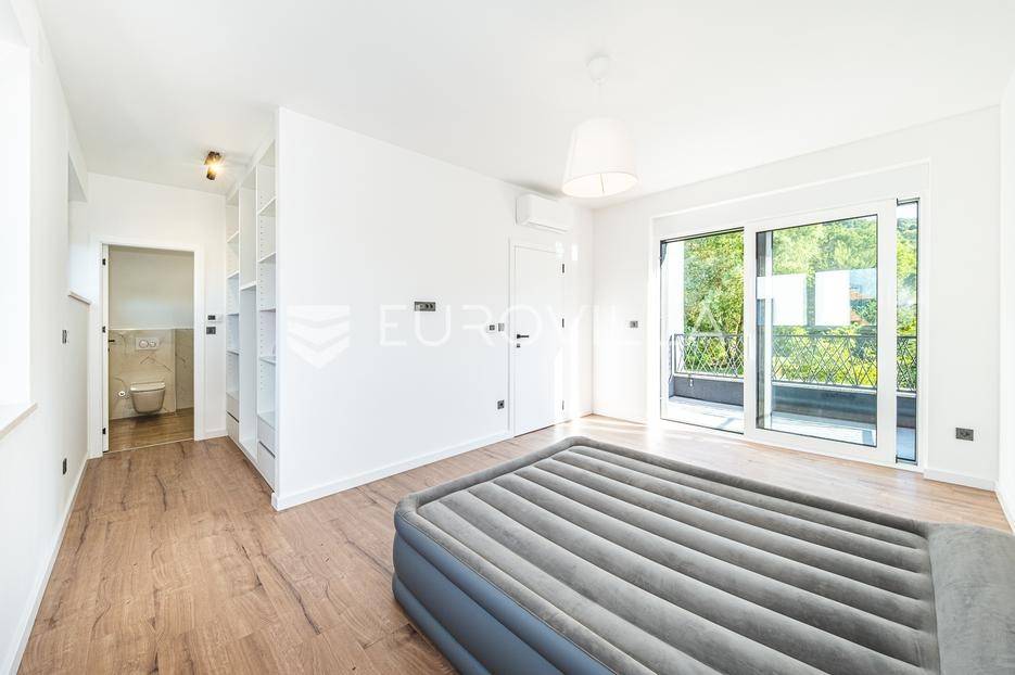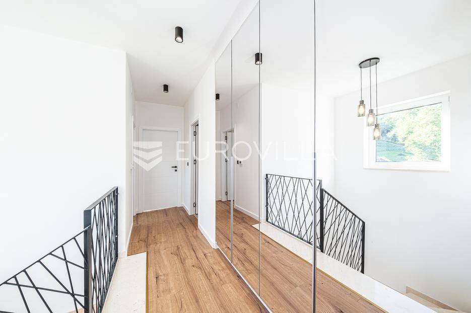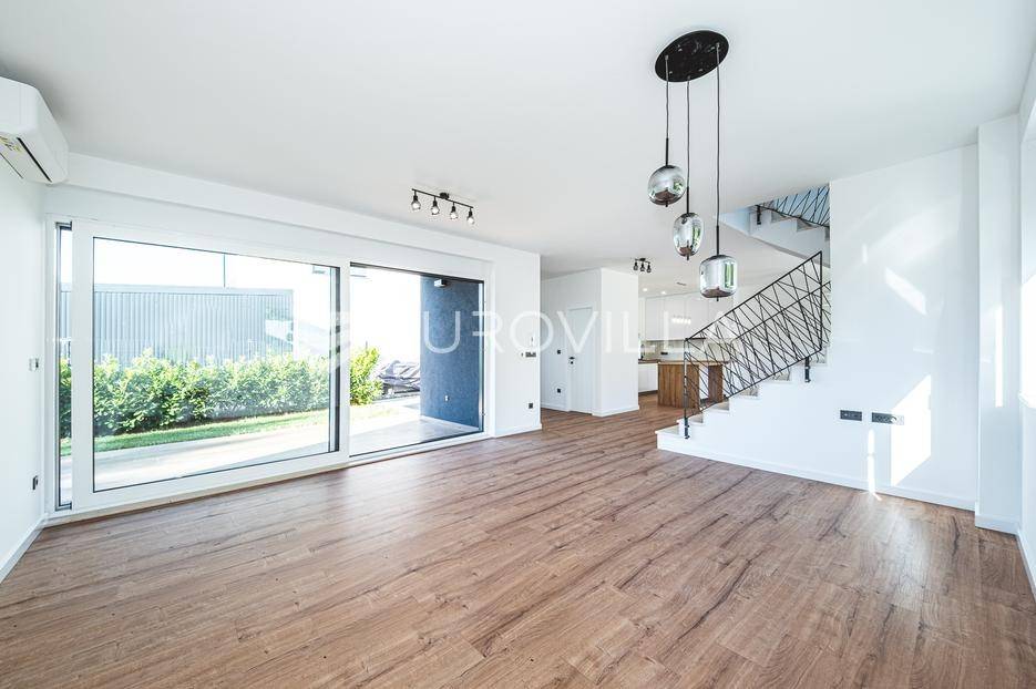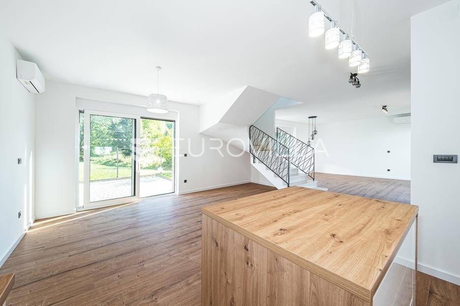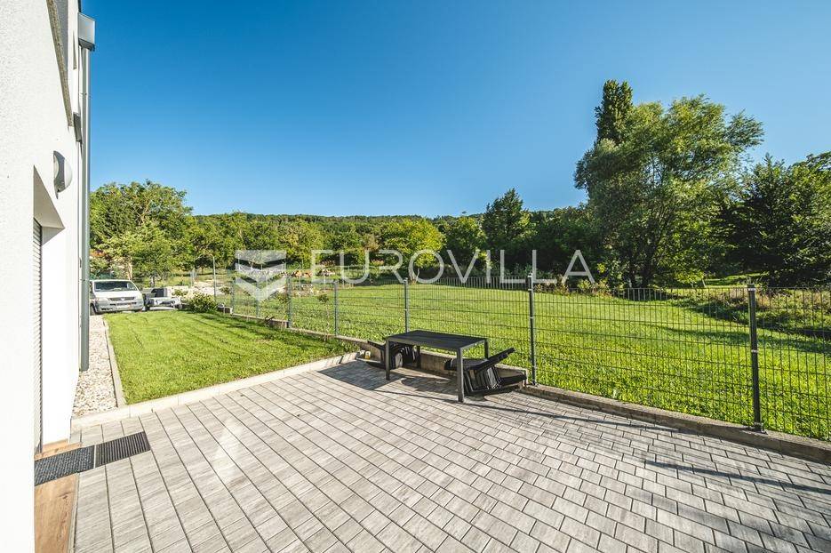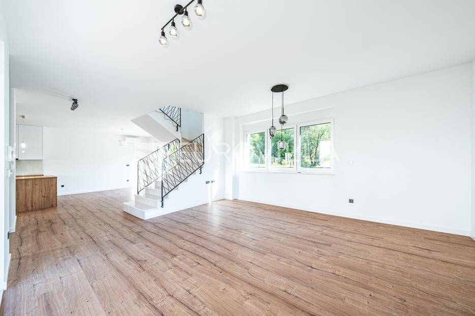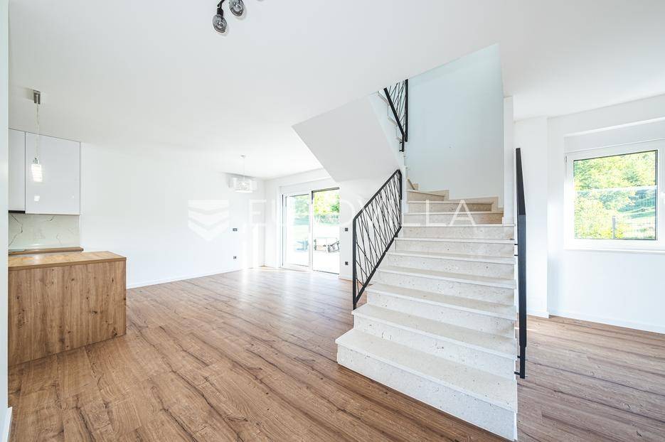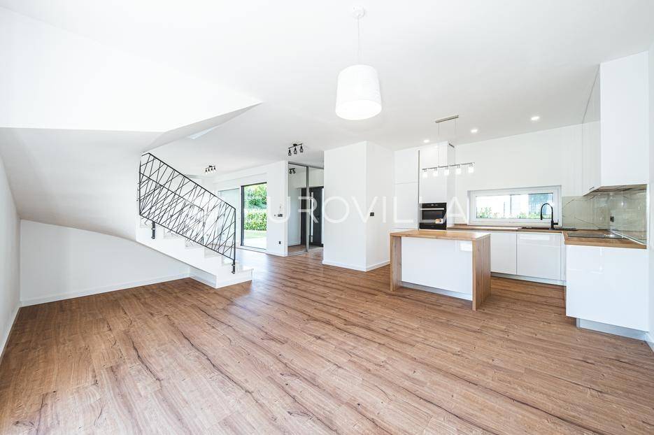 Zagreb, Šestine, prvi najam prekrasnog dvoetažnog dvojnog objekta u novogradnji, 110 m2 zatvorene površine s prostranim vrtom, garažnim i vanjskim parkirnim mjestom na izuzetnoj lokaciji nadomak šume.Nalazi se u dvojnom objektu s dva dvoetažna stana te svaki ima vlastiti ulaz i vrt za privatnost, samim time pruža osjećaj stanovanja u kući.Na prvoj etaži se nalazi ulazni prostor, prostrani dnevni boravak, kuhinja i blagovaonica, ukupno 50 m2. Također, dodatno je u prizemlju vanjski toalet te ima izlaz na terasu iz boravka prema južnoj strani i blagovaonskog dijela prema sjevernoj strani. U produžetku terasa je prostrani travnjak i zelenilo idealno za obiteljsko druženje i dječiju igru. Lijepim stepenicama idemo na gornju etažu na kojoj se nalaze tri spavaće sobe (jedna ima prekrasni balkon sa pogledom na zelenilo), kupaonica i vešeraj. Jedna od spavaćih soba je master soba te ima walkin garderobu i vlastitu kupaonicu.Lokacija kuće je iznimna, svega desetak minuta vožnje od centra grada, u blizini internacionalnih škola i ambasada, a najveća prednost je to što je sa istočne i sjeverne strane okružuje zelenilo i šuma. Time je savršena za one koji žele spojiti privatnost i mir sa životom u gradu.Za ostala pitanja stojimo Vam na raspolaganju.