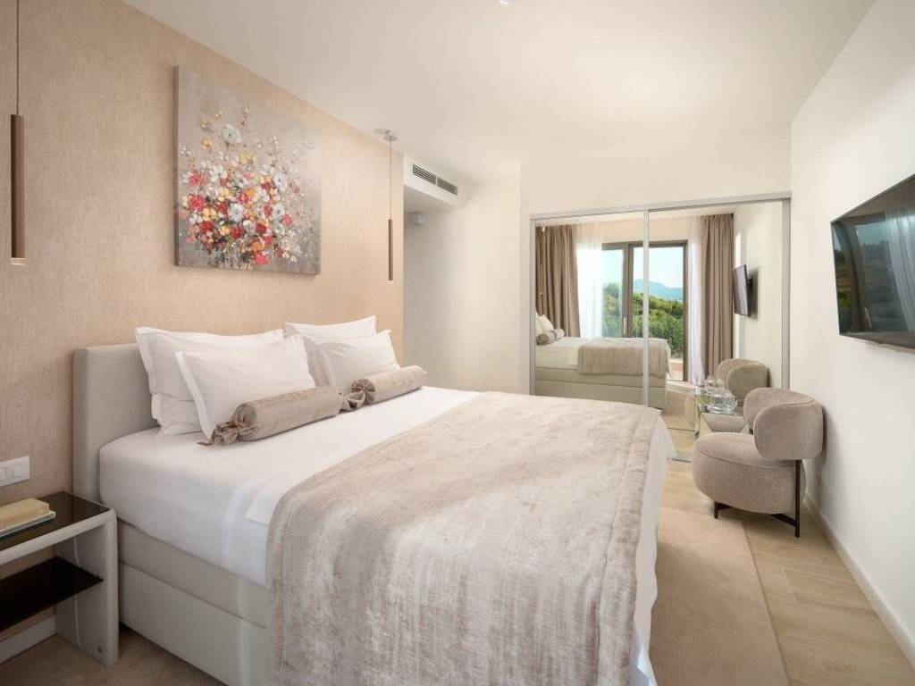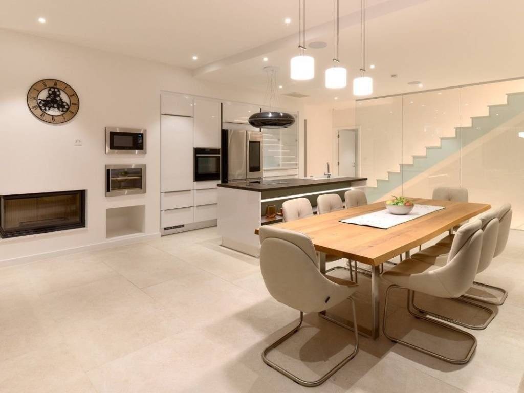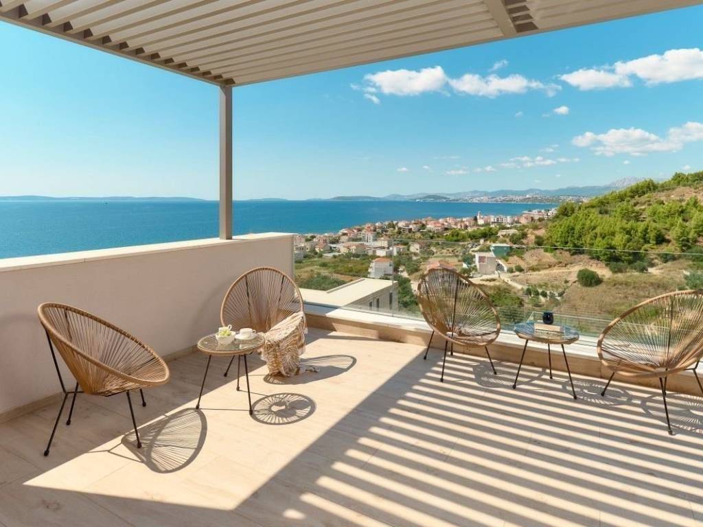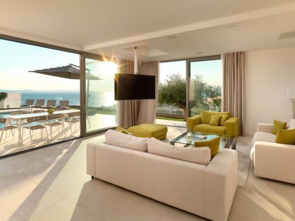 This luxury villa is located in a peaceful part of Podstrana. Set on a landscaped plot of almost 900 m², it extends over three floors, featuring a flat roof and an airy interior where indoor and outdoor spaces blend seamlessly. Large glass walls open up panoramic views of the sea and nearby islands, while allowing an abundance of natural light to fill the space, creating a sense of openness and connection with the surroundings.   The basement is designed as an intimate zone for relaxation and rejuvenation. A wellness area with a sauna and jacuzzi, laundry room, bathroom, spacious storage and technical room provide everything needed for complete comfort.   The ground floor is conceived as an open-plan living area where the kitchen, dining room and spacious living room flow effortlessly onto the terrace and pool area. From the living space, there is access to a covered terrace, sun deck and the pool, which serves as the centerpiece of the outdoor area. This floor also features two comfortable bedrooms, each with its own en-suite bathroom, along with a guest toilet and a practical storage room.   The first floor houses three more luxuriously appointed bedrooms, each with an en-suite bathroom, two of which are south-facing with direct access to terraces offering sea views.   The entire property is designed to provide maximum privacy and comfort, with two parking spaces, a landscaped garden with ample greenery, and a pool as the focal point of the outdoor area. The villa is built with high-quality reinforced concrete construction and carefully selected finishing materials, while glass railings on the terraces further emphasize the property’s modern character.