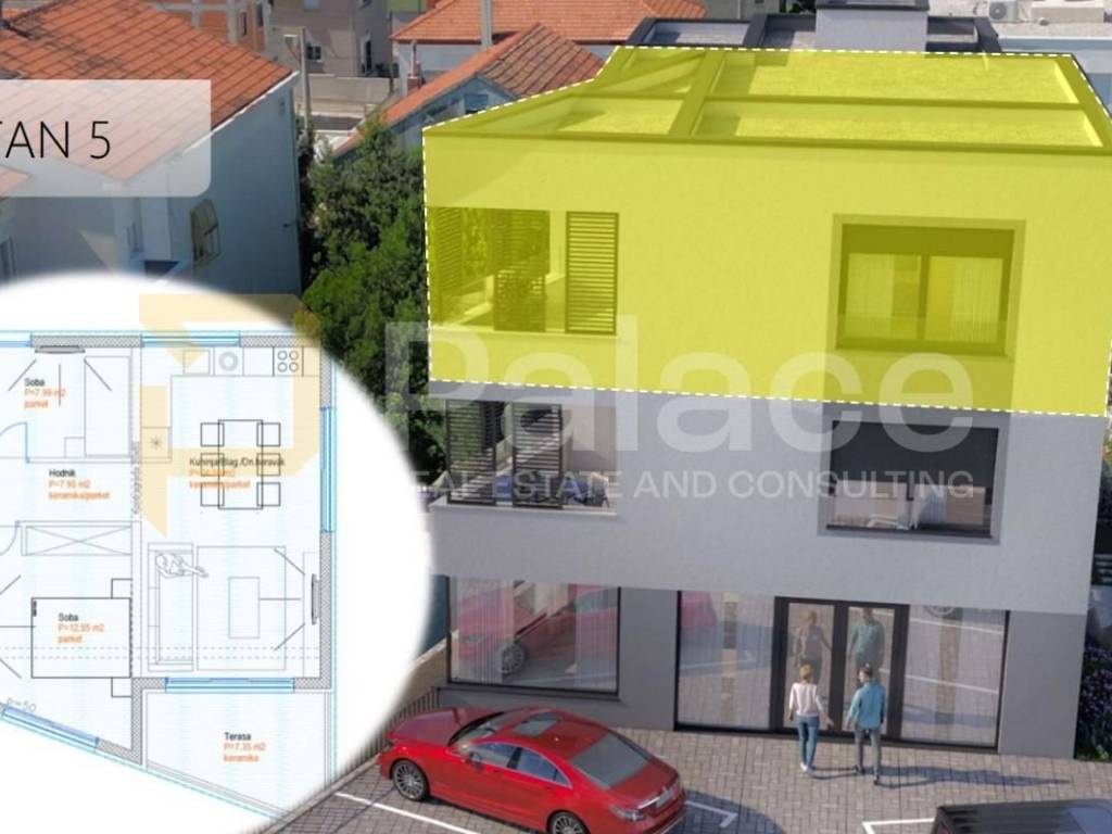 A three-bedroom apartment in a new building in Zadar is for sale, located in the quiet and sought-after neighborhood of Belafuža. The building is smaller and intimate, with a total of five apartments and commercial space on the ground floor, and an elevator connecting the basement, ground floor, and upper floors.