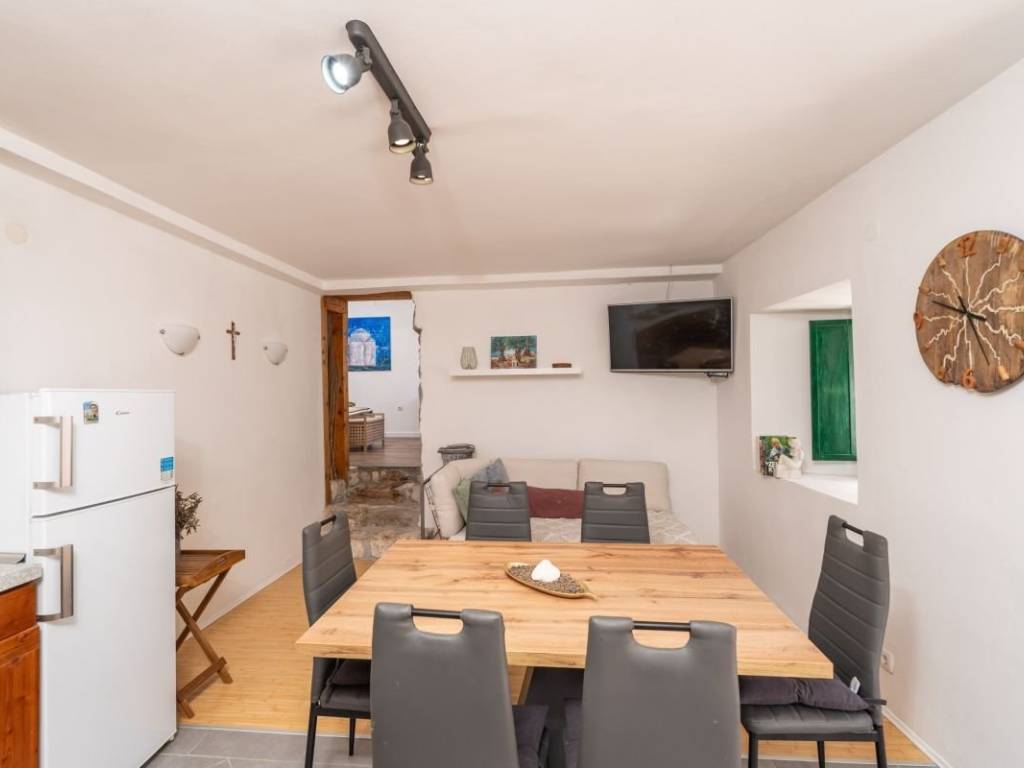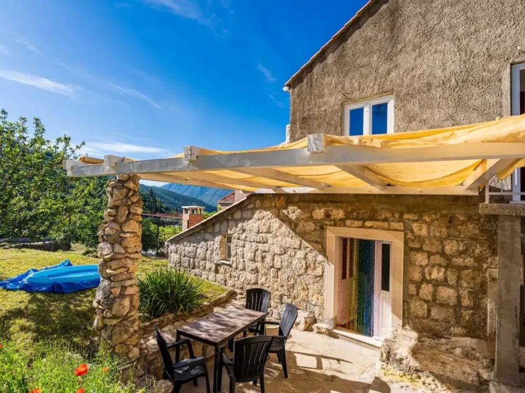 Property for sale in a protected natural area of the city of Dubrovnik, with an open view of the Rijeka dubrovačka. The property is located on an elevated location and consists of the main house, two auxiliary buildings, a garden of 700m2 and a parking space.   The main house is a traditional stone building, 77m2 in size, with a use permit. It was renovated in 2024 and consists of a kitchen with a living room, a bathroom and a large bedroom on the ground floor, while on the first floor there are additional rooms that are currently used as sleeping space.   The house is fully equipped, with air conditioning on the ground floor and on the first floor and electric heating. Near the main house there is the first auxiliary building, also a stone house with a use permit, 36m2 in size. This building requires renovation, however, it has a water tank and a chimney.   The second auxiliary building, further away from the house, 32m2 in size, also has a use permit and is currently in a unfinished state.   The property is fully owned 1/1, with no encumbrances. It is currently used for rental purposes. Both smaller buildings for renovation can be converted into rental units, which gives this property exceptional potential.