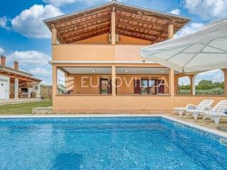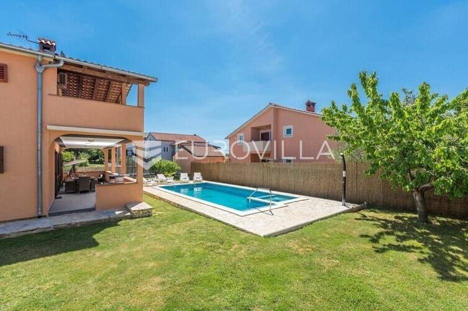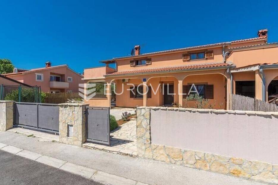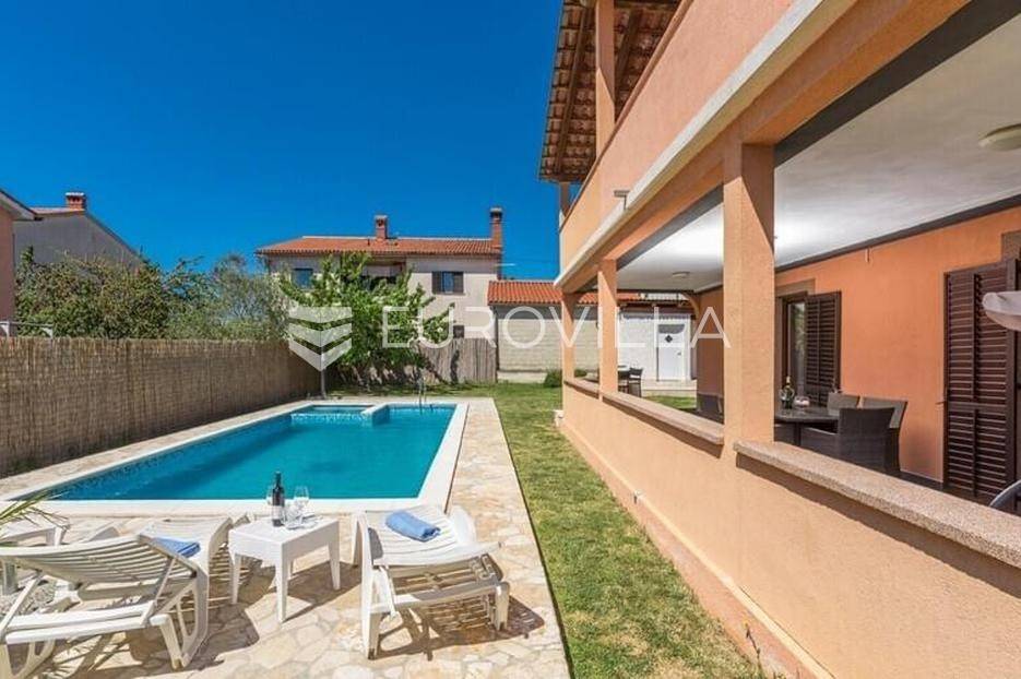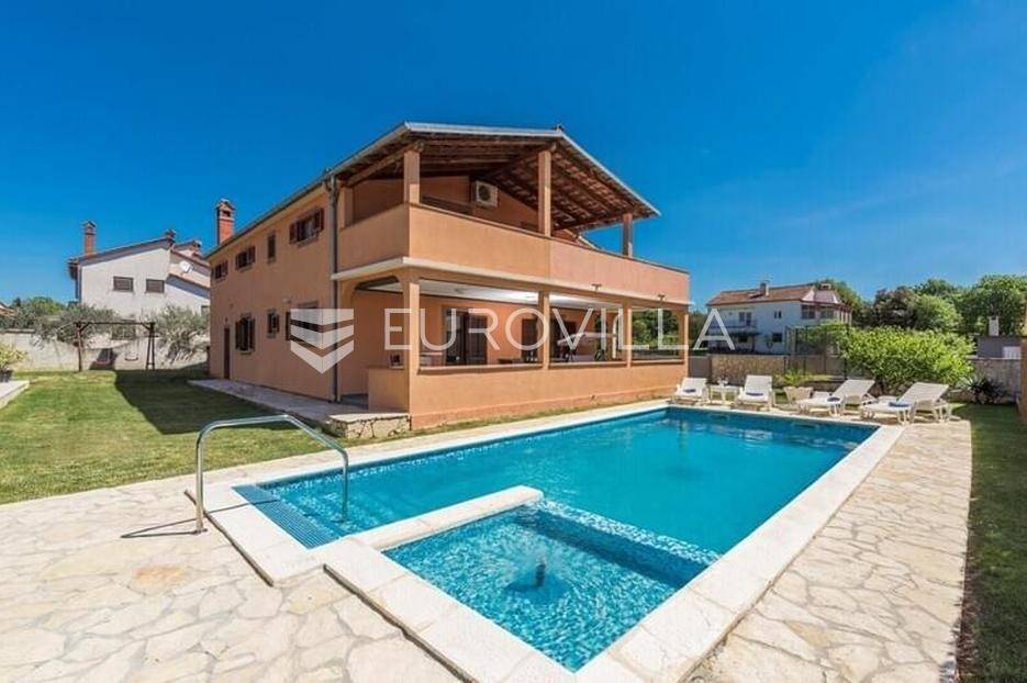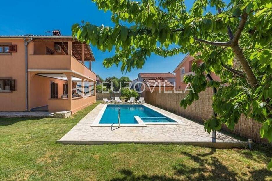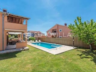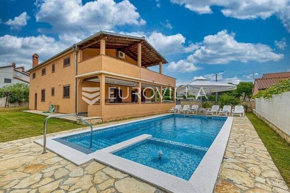Ova velika, elegantna samostojeća kuća nalazi se na svega 10 min od Pule.Smještena u manjem, urednom i lijepom mjestu Loborika proteže se kroz dvije etaže, koje su u naravi dva velika i komforna stana. Prikladni za život i turistički najam.Stan u prizemlju NKP 100 m2 sastoji se od u potpunosti opremljene kuhinje i dnevnog boravka s izlazom na terasu i bazen s hidromasažnim mlaznicama, dječji bazen s vodenom gljivom, dvije komforne spavaće sobe s bračnim krevetom i dodatkom krevet za jednu osobu, kupaone. Dvorišni je dio u potpunosti ograđen, u jednom se dijelu nalazi natkrivena vanjska kuhinja s roštiljem i stolom za blagovanje.Stan na gornjoj etaži ima tri spavaće sobe, raskošnih 120 m2 velik, veliku terasu od 33 m2 te dodatnu terasu od 15 m2.Konoba NKP 15 m2 je idealno mjesto za druženja i okupljanje s prijateljima. Na raspolaganju je i velika garaža 35 m2 - prostor za jedno vozilo i skladištenje. Grijanje cijele kuće je plinsko te je ugodna temperatura tijekom zimskih mjeseci garantirana.Bazen u dvorišnom dijelu na uređenoj okućnici je dimenzija 8.5 x 4 m idealan za osvježenje tijekom ljetnih mjeseci.Ova velika i uredna kuća uspješno se iznajmljuje tijekom ljetnih mjeseci i ostvaruje lijep prinos.Za više informacija, organizaciju razgleda stojimo Vam na raspolaganju.