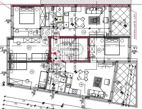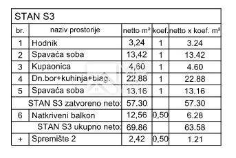 The apartment in question marked "S3" is located in building no. 9, on the 1st floor, and consists of: hallway, living room + kitchen + dining room, 2 bedrooms, bathroom and covered balcony.