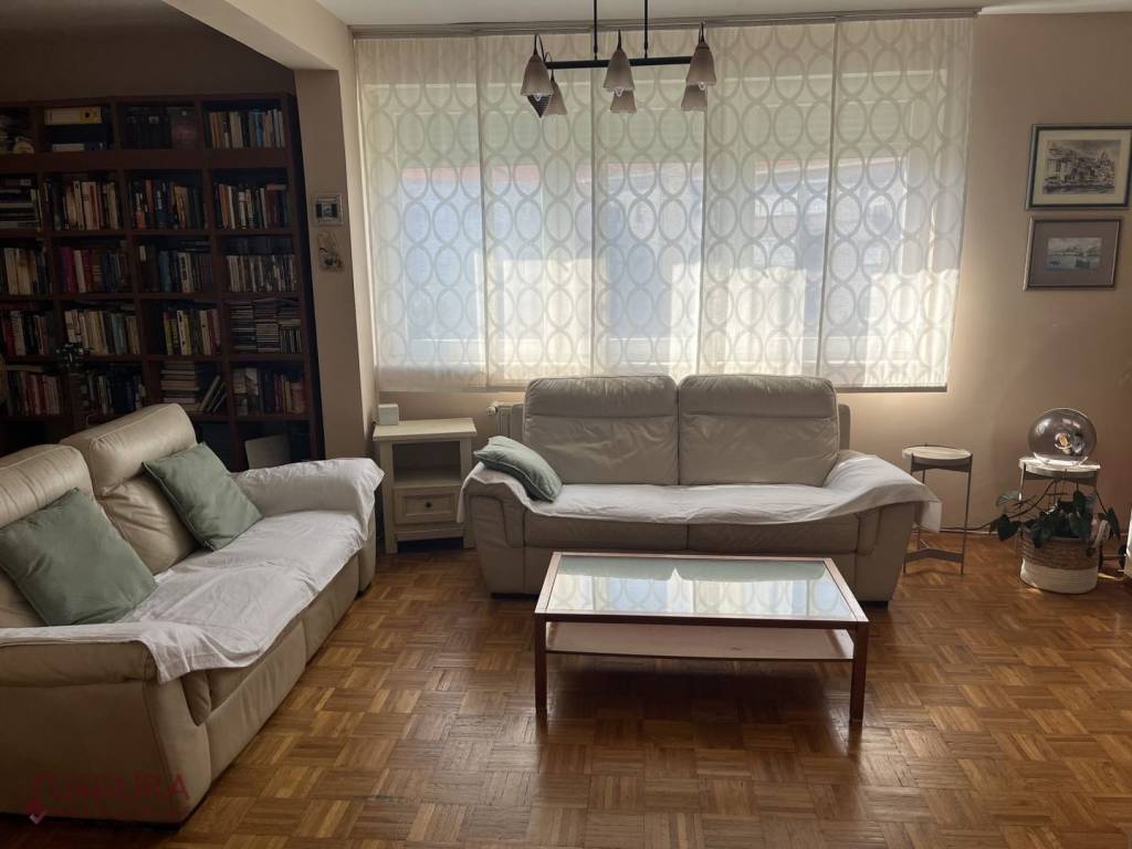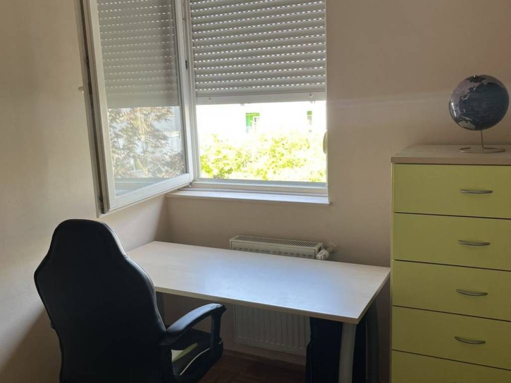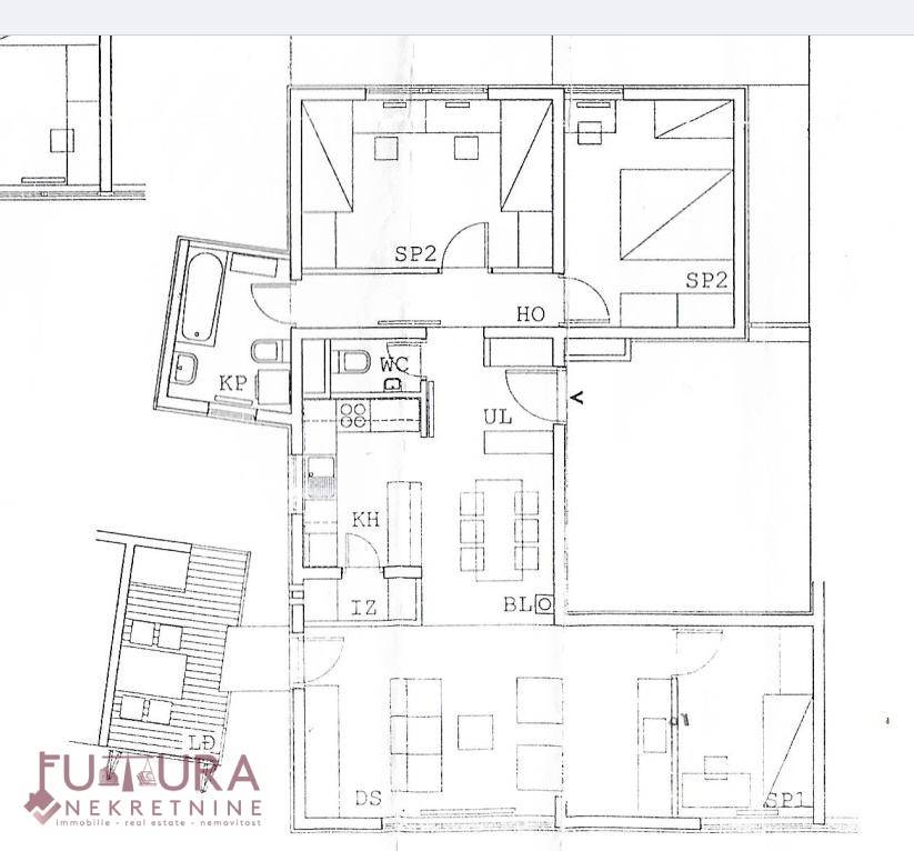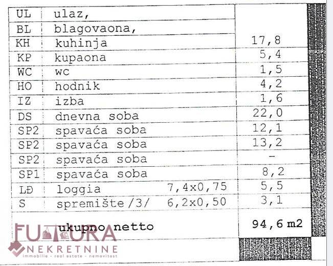 Sastoji se od: tri spavaće sobe, dnevnog boravka + kuhinja + blagovaona, hodnika, ostave, wc-a, kupaonice i balkona.