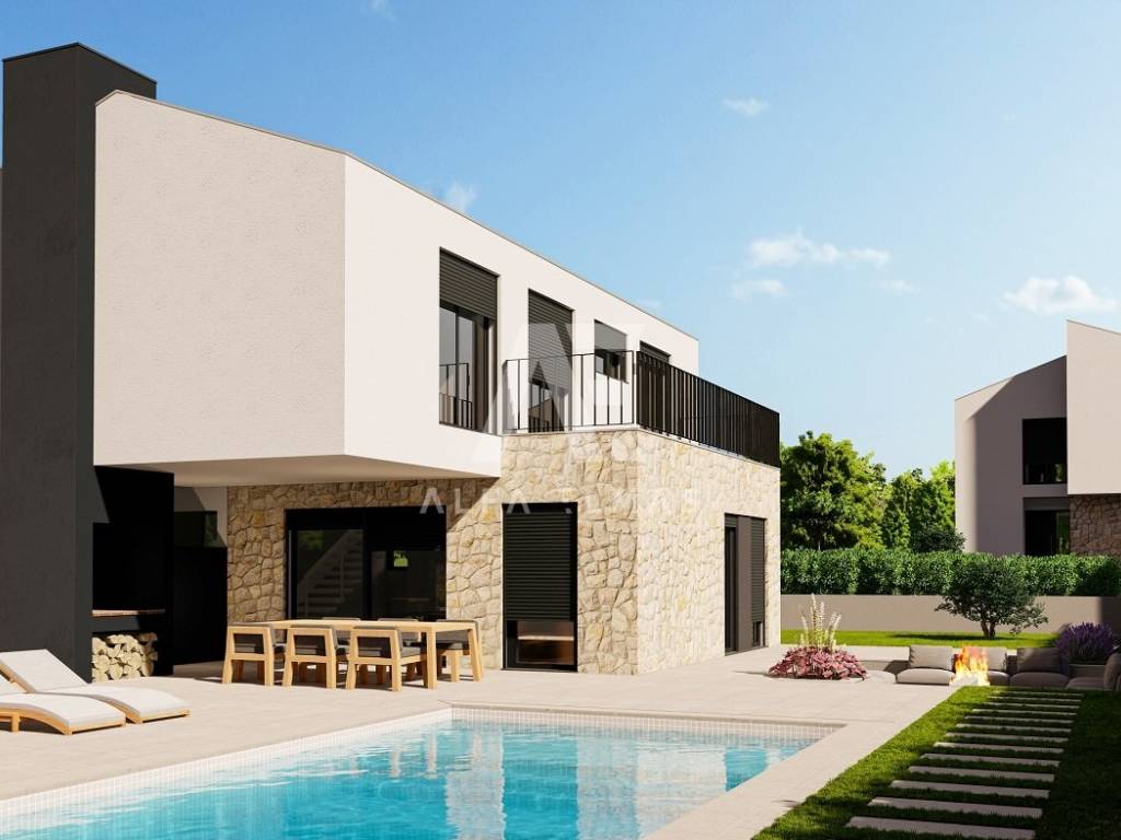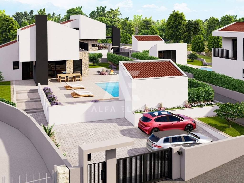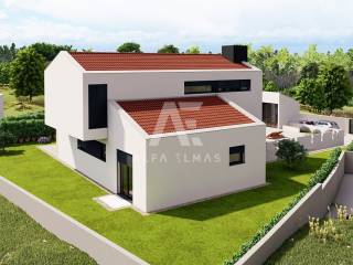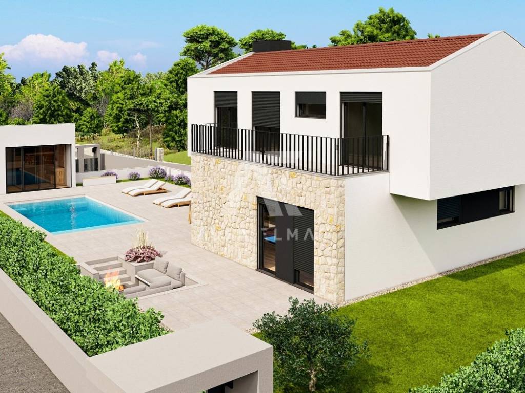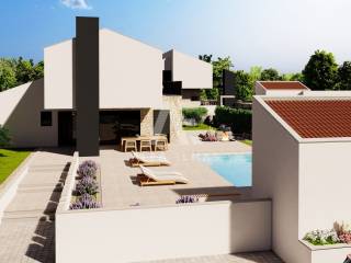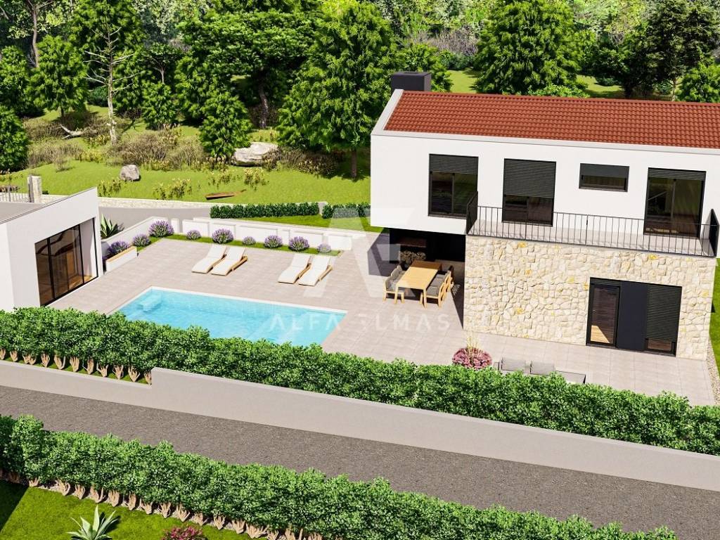 Malinska, surroundings, modern imposing villa under construction located in a quiet location of a small island town! This modern luxury villa with a heated swimming pool extends over two spacious floors with a total living area of 177.12 m2, and the peace and privacy is additionally decorated by a landscaped garden of 658 m2. On the first floor of the villa there are three airy bedrooms, one of which has its own bathroom with a walk-in shower. The other two bedrooms share one bathroom and an outdoor, uncovered terrace. The spacious ground floor will have an abundance of natural light, while it will consist of an entrance hall, a guest toilet, a bathroom, a room with access to an outdoor uncovered terrace, technical rooms, a kitchen, a dining room and a spacious living room with access to an outdoor covered terrace with an outdoor kitchen. , a grill area, a heated swimming pool with a sunbathing area and a lounge area with a fireplace in the middle. The external auxiliary facility will be reserved for the SPA facilities on the ground floor, which include a sauna, a jacuzzi and a wellness area for relaxation. The modern stone villa will be equipped with high-quality carpentry, floor coverings made of high-quality ceramics and stone, high-quality sanitary facilities, ceiling air conditioners and underfloor heating with a heat pump. The environment itself will be beautifully decorated with Mediterranean plants, green areas with lots of stone details. Documentation in order!!