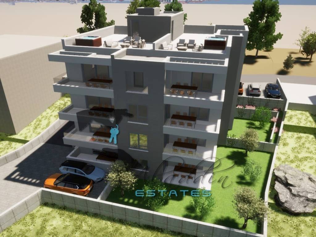 Extremely attractive residential building with four floors in a new development in Okrug Gornji, on the island of Čiovo, with a total of 11 apartments. Apartment S10 on the second floor is available, consisting of a living room and dining area as one unit, kitchen, hallway, three bedrooms, two bathrooms, corridor, and a covered terrace. The apartment also includes an outdoor parking space and a spectacular rooftop terrace with luxurious lighting and installations for setting up a summer kitchen and jacuzzi as desired. In short: