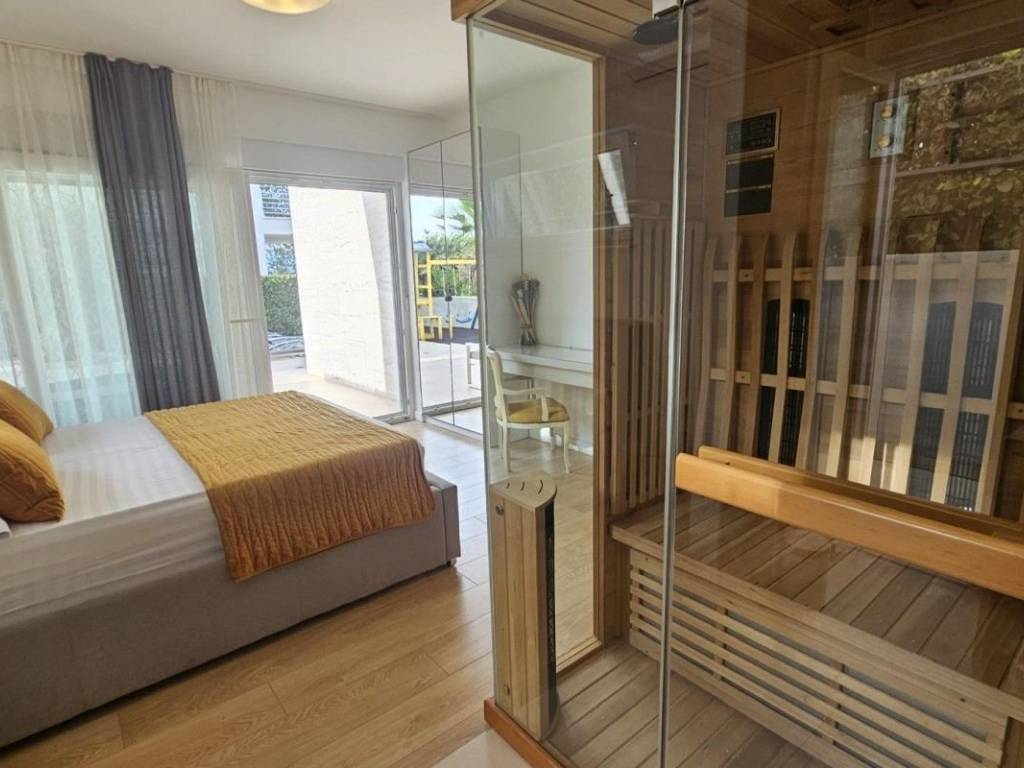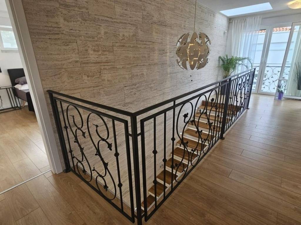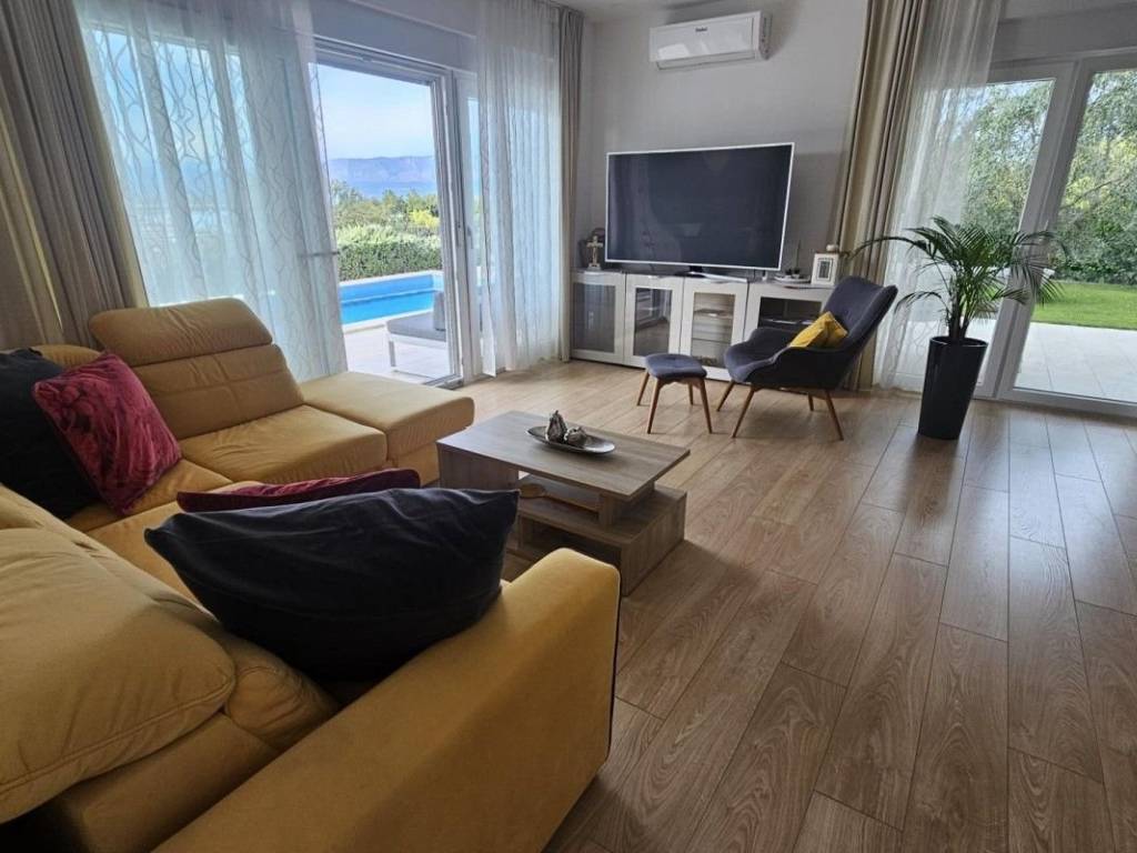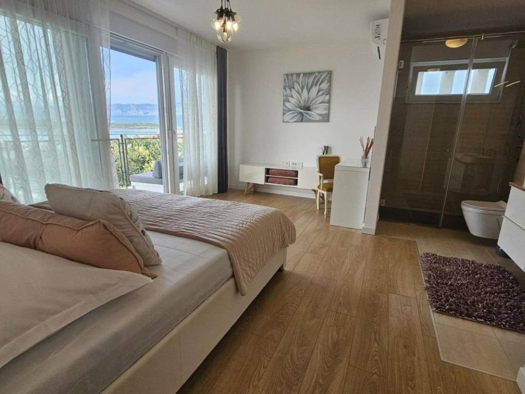 A modern luxury villa is for sale in Soline Bay on the island of Krk, located in a peaceful setting just 250 meters from the beach. The villa has a total living area of ​​220 m² and is spread over two floors. On the ground floor there is a spacious living room with kitchen and dining area, a bedroom with a private bathroom and infrared sauna, and an open lobby with a jacuzzi. On the first floor there are three bedrooms, each with a private bathroom and a terrace offering panoramic sea views. The 450 m² plot is decorated with Mediterranean vegetation and old olive trees. There is a private heated swimming pool with an outdoor shower, a sunbathing area, several terraces with a sea view, a summer kitchen, a barbecue and a carefully maintained garden. The property is built with high-quality materials and is equipped with underfloor heating in the bathrooms, solar heating of sanitary water, six inverter air conditioners, a video intercom and an alarm system. It is fully furnished with modern furniture and top-quality appliances and is sold as such. It is a property that combines luxury, functionality and an attractive location near the sea.
