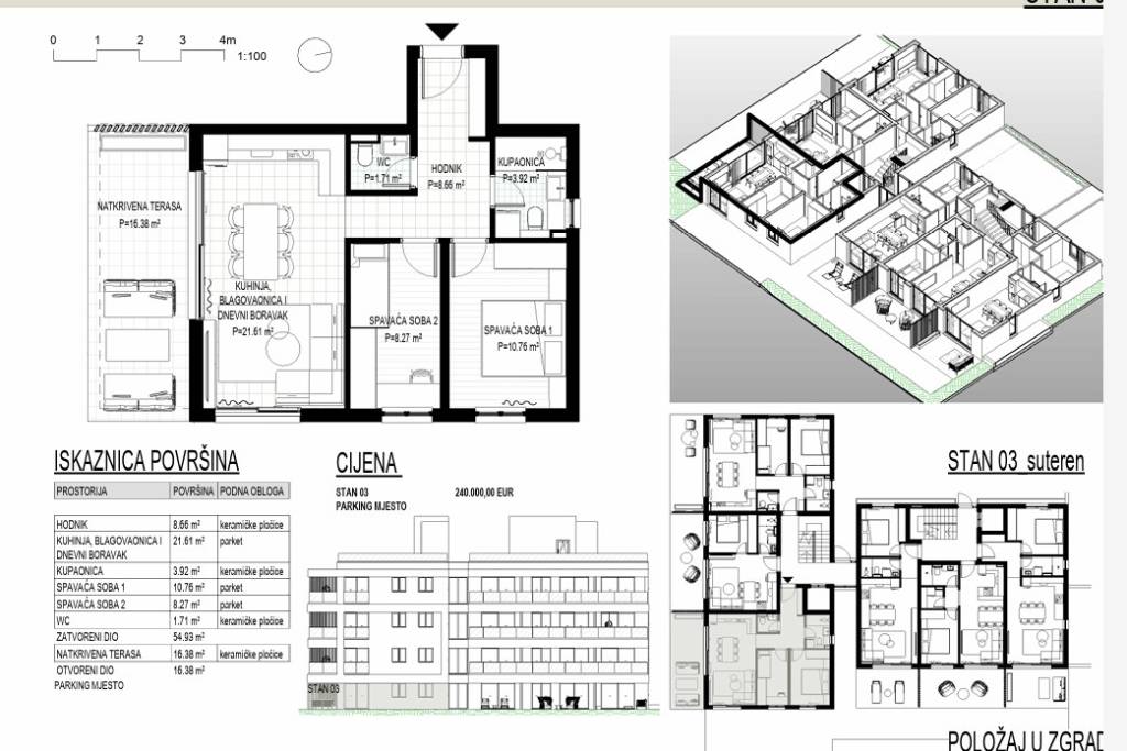 U popularnom odmaralištu srednje Dalmacije, Okrugu Gornjem na Čiovu gradi se stambeni objekta s 24 apartmana na pješačkoj udaljenosti od plaže od 370 m.Objekt se gradi na 5 etaža (jedna podzemna etaža i četiri nadzemne etaže ) uz iskoristivu krovnu terasu koja pripada stanovima na zadnjem katu. Objekt će imati lift.Apartman S3 u prizemlju (u projektu je označen kao suteren) orijentacije jug se sastoji od ulaznog prostora od 8 m2, dnevnog prostora površine 21 m2 (kuhinja, blagovaonica i dnevni boravak), dvije spavaće sobe površina 10 m2 odnosno 8 m2, kupaonice površine 4 m2, toaleta površine 2 m2 i natkrivene terase površine od 16 m2.Svi apartmani će biti opremljeni podnim grijanjem i klima uređajima u dnevnom prostoru i jednoj spavaćoj sobi a podne obloge će biti od keramičkih pločica prve klase. Prozori će biti od PVC-a s komaricama i roletama na struju a vanjska fasadna izolacija će biti od stiropora debljine 10 cm.U fazi izgradnje još je moguće dogovarati uređenje interijera.Za svaki apartman u prizemlju je predviđeno jedno vanjsko parking mjesto.Očekivani početak radova je ljeto 2026 godine a useljenje početak 2028 godine. Trenutačno se primaju rezervacije a nakon početka radova potpisuje se predugovor.Način plaćanja: rezervacija min 5.000 eura / 30 % prilikom potpisa predugovora / 30 % nakon završetka konstrukcijskih radova / 15 % nakon završetka fasade / 15 % nakon završetka unutrašnjosti / 10 % nakon ishođenja uporabne dozvole.Kako je otok Čiovo svojevrstan produžetak grada Trogira, nudi pregršt mogućnosti za odmor, rekreaciju i kupanje te razgledavanje mnogobrojnih povijesnih spomenika.