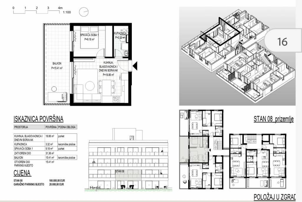 U popularnom odmaralištu srednje Dalmacije, Okrugu Gornjem na Čiovu gradi se stambeni objekta s 24 apartmana na pješačkoj udaljenosti od plaže od 370 m.Objekt se gradi na 5 etaža (jedna podzemna etaža i četiri nadzemne etaže ) uz iskoristivu krovnu terasu koja pripada stanovima na zadnjem katu. Objekt će imati lift.Apartman S8 na prvom katu (u projektu označen kao prizemlje) orijentacije jug se sastoji od dnevnog prostora površine 18,8 m2 (kuhinja, blagovaonica i dnevni boravak), spavaće sobe površina 9 m2, kupaonice površine 3,3 m2 i natkrivene terase površine 15 m2.Svi apartmani će biti opremljeni podnim grijanjem i klima uređajima u dnevnom prostoru i jednoj spavaćoj sobi a podne obloge će biti od keramičkih pločica prve klase. Prozori će biti od PVC-a s komaricama i roletama na struju a vanjska fasadna izolacija će biti od stiropora debljine 10 cm.U fazi izgradnje još je moguće dogovarati uređenje interijera.Apartmanu S8 pripada garažno parking mjesto po cijeni od 20.000 eura.Očekivani početak radova je ljeto 2026 godine a useljenje početak 2028 godine. Trenutačno se primaju rezervacije a nakon početka radova potpisuje se predugovor.Način plaćanja: rezervacija min 5.000 eura / 30 % prilikom potpisa predugovora / 30 % nakon završetka konstrukcijskih radova / 15 % nakon završetka fasade / 15 % nakon završetka unutrašnjosti / 10 % nakon ishođenja uporabne dozvole.Kako je otok Čiovo svojevrstan produžetak grada Trogira, nudi pregršt mogućnosti za odmor, rekreaciju i kupanje te razgledavanje mnogobrojnih povijesnih spomenika.
