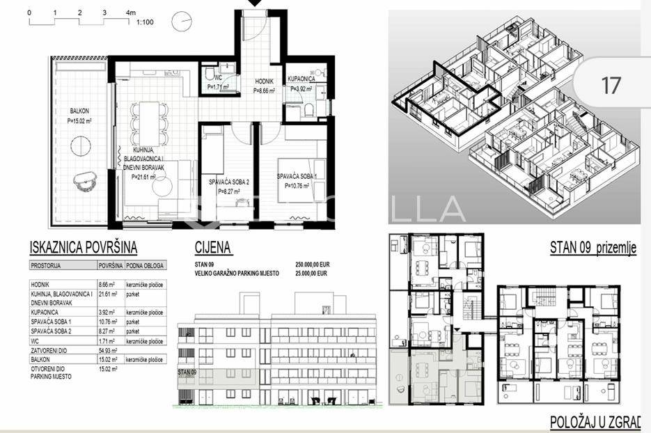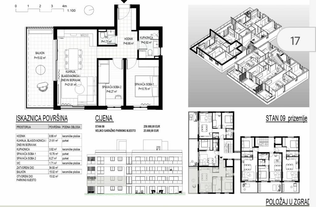 U popularnom odmaralištu srednje Dalmacije, Okrugu Gornjem na Čiovu gradi se stambeni objekta s 24 apartmana na pješačkoj udaljenosti od plaže od 370 m.Objekt se gradi na 5 etaža (jedna podzemna etaža i četiri nadzemne etaže ) uz iskoristivu krovnu terasu koja pripada stanovima na zadnjem katu. Objekt će imati lift.Apartman S9 na prvom katu (u projektu označen kao prizemlje) orijentacije jug se sastoji od ulaznog prostora površine 8,5 m2, dnevnog prostora površine 21,6 m2 (kuhinja, blagovaonica i dnevni boravak), dvije spavaće sobe površine 10 m2 odnosno 8 m2, kupaonice površine 4 m2, toaleta površine 1,7 m2 i natkrivene terase površine 15 m2.Svi apartmani će biti opremljeni podnim grijanjem i klima uređajima u dnevnom prostoru i jednoj spavaćoj sobi a podne obloge će biti od keramičkih pločica prve klase. Prozori će biti od PVC-a s komaricama i roletama na struju a vanjska fasadna izolacija će biti od stiropora debljine 10 cm.U fazi izgradnje još je moguće dogovarati uređenje interijera.Apartmanu S9 pripada veliko garažno parking mjesto po cijeni od 25.000 eura.Očekivani početak radova je ljeto 2026 godine a useljenje početak 2028 godine. Trenutačno se primaju rezervacije a nakon početka radova potpisuje se predugovor.Način plaćanja: rezervacija min 5.000 eura / 30 % prilikom potpisa predugovora / 30 % nakon završetka konstrukcijskih radova / 15 % nakon završetka fasade / 15 % nakon završetka unutrašnjosti / 10 % nakon ishođenja uporabne dozvole.Kako je otok Čiovo svojevrstan produžetak grada Trogira, nudi pregršt mogućnosti za odmor, rekreaciju i kupanje te razgledavanje mnogobrojnih povijesnih spomenika.