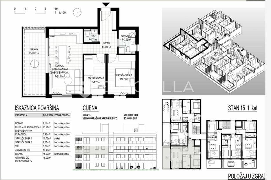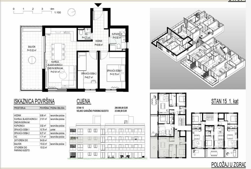 U popularnom odmaralištu srednje Dalmacije, Okrugu Gornjem na Čiovu gradi se stambeni objekta s 24 apartmana na pješačkoj udaljenosti od plaže od 370 m.Objekt se gradi na 5 etaža (jedna podzemna etaža i četiri nadzemne etaže ) uz iskoristivu krovnu terasu koja pripada stanovima na zadnjem katu. Objekt će imati lift.Apartman S15 na drugom katu (u projektu označen kao prvi kat) orijentacije jug se sastoji od ulaznog prostora površine 8,5 m2, dnevnog prostora površine 21,6 m2 (kuhinja, blagovaonica i dnevni boravak), dvije spavaće sobe površine 10 m2 odnosno 8 m2, kupaonice površine 4 m2, toaleta površine 1,7 m2 i natkrivene terase površine 15 m2.Svi apartmani će biti opremljeni podnim grijanjem i klima uređajima u dnevnom prostoru i jednoj spavaćoj sobi a podne obloge će biti od keramičkih pločica prve klase. Prozori će biti od PVC-a s komaricama i roletama na struju a vanjska fasadna izolacija će biti od stiropora debljine 10 cm.U fazi izgradnje još je moguće dogovarati uređenje interijera.Apartmanu S15 pripada veliko garažno parking mjesto po cijeni od 25.000 eura.Očekivani početak radova je ljeto 2026 godine a useljenje početak 2028 godine. Trenutačno se primaju rezervacije a nakon početka radova potpisuje se predugovor.Način plaćanja: rezervacija min 5.000 eura / 30 % prilikom potpisa predugovora / 30 % nakon završetka konstrukcijskih radova / 15 % nakon završetka fasade / 15 % nakon završetka unutrašnjosti / 10 % nakon ishođenja uporabne dozvole.Kako je otok Čiovo svojevrstan produžetak grada Trogira, nudi pregršt mogućnosti za odmor, rekreaciju i kupanje te razgledavanje mnogobrojnih povijesnih spomenika.