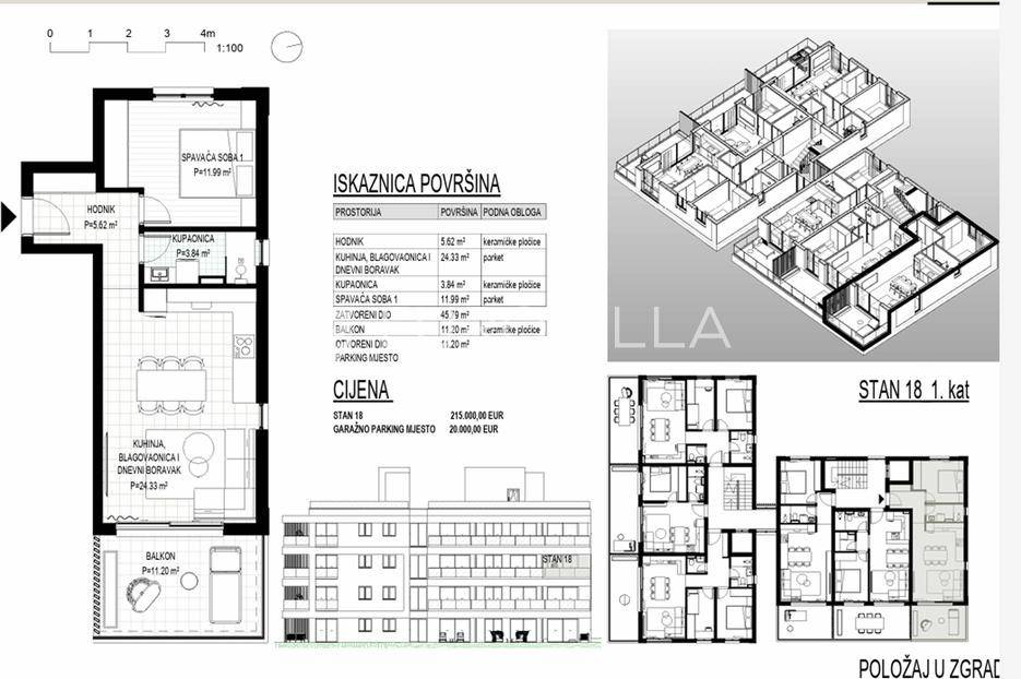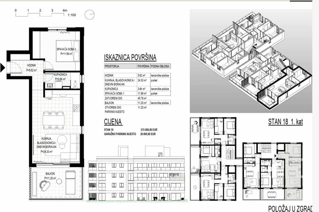 U popularnom odmaralištu srednje Dalmacije, Okrugu Gornjem na Čiovu gradi se stambeni objekta s 24 apartmana na pješačkoj udaljenosti od plaže od 370 m.Objekt se gradi na 5 etaža (jedna podzemna etaža i četiri nadzemne etaže ) uz iskoristivu krovnu terasu koja pripada stanovima na zadnjem katu. Objekt će imati lift.Apartman S18 na drugom katu (u projektu označen kao prvi kat) orijentacije istok se sastoji od ulaznog prostora površine 5,6 m2, dnevnog prostora površine 24,3 m2 (kuhinja, blagovaonica i dnevni boravak), spavaće sobe površine 12 m2, kupaonice površine 3,8 m2 i natkrivene terase površine od 11,2 m2.Svi apartmani će biti opremljeni podnim grijanjem i klima uređajima u dnevnom prostoru i jednoj spavaćoj sobi a podne obloge će biti od keramičkih pločica prve klase. Prozori će biti od PVC-a s komaricama i roletama na struju a vanjska fasadna izolacija će biti od stiropora debljine 10 cm.U fazi izgradnje još je moguće dogovarati uređenje interijera.Apartmanu S18 pripada garažno parking mjesto po cijeni od 20.000 eura.Očekivani početak radova je ljeto 2026 godine a useljenje početak 2028 godine. Trenutačno se primaju rezervacije a nakon početka radova potpisuje se predugovor.Način plaćanja: rezervacija min 5.000 eura / 30 % prilikom potpisa predugovora / 30 % nakon završetka konstrukcijskih radova / 15 % nakon završetka fasade / 15 % nakon završetka unutrašnjosti / 10 % nakon ishođenja uporabne dozvole.Kako je otok Čiovo svojevrstan produžetak grada Trogira, nudi pregršt mogućnosti za odmor, rekreaciju i kupanje te razgledavanje mnogobrojnih povijesnih spomenika.