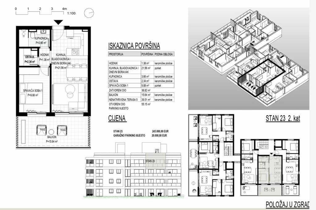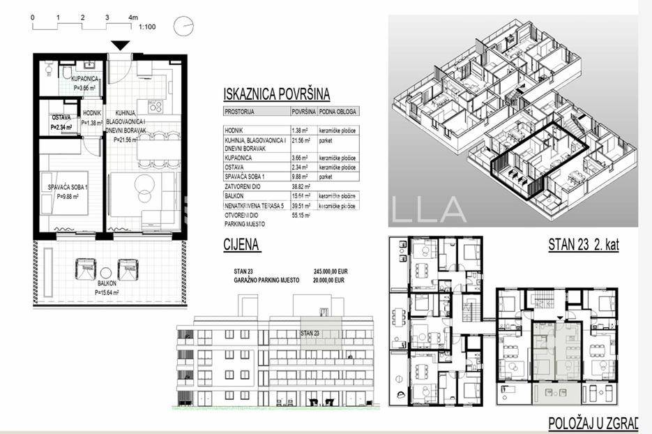 U popularnom odmaralištu srednje Dalmacije, Okrugu Gornjem na Čiovu gradi se stambeni objekta s 24 apartmana na pješačkoj udaljenosti od plaže od 370 m.Objekt se gradi na 5 etaža (jedna podzemna etaža i četiri nadzemne etaže ) uz iskoristivu krovnu terasu koja pripada stanovima na zadnjem katu. Objekt će imati lift.Apartman S23 na trećem katu (u projektu označen kao drugi kat) orijentacije istok se sastoji od ulaznog prostora površine 1,45 m2, dnevnog prostora površine 21,5 m2 (kuhinja, blagovaonica i dnevni boravak), spavaće sobe površine 9,8 m2, kupaonice površine 3,5 m2, ostave površine 2,2 m2, natkrivene terase površine 15,6 m2 i nenatkrivene krovne terase površine 39,5 m2.Svi apartmani će biti opremljeni podnim grijanjem i klima uređajima u dnevnom prostoru i jednoj spavaćoj sobi a podne obloge će biti od keramičkih pločica prve klase. Prozori će biti od PVC-a s komaricama i roletama na struju a vanjska fasadna izolacija će biti od stiropora debljine 10 cm.U fazi izgradnje još je moguće dogovarati uređenje interijera.Apartmanu S23 pripada garažno parking mjesto po cijeni od 20.000 eura.Očekivani početak radova je ljeto 2026 godine a useljenje početak 2028 godine. Trenutačno se primaju rezervacije a nakon početka radova potpisuje se predugovor.Način plaćanja: rezervacija min 5.000 eura / 30 % prilikom potpisa predugovora / 30 % nakon završetka konstrukcijskih radova / 15 % nakon završetka fasade / 15 % nakon završetka unutrašnjosti / 10 % nakon ishođenja uporabne dozvole.Kako je otok Čiovo svojevrstan produžetak grada Trogira, nudi pregršt mogućnosti za odmor, rekreaciju i kupanje te razgledavanje mnogobrojnih povijesnih spomenika.
