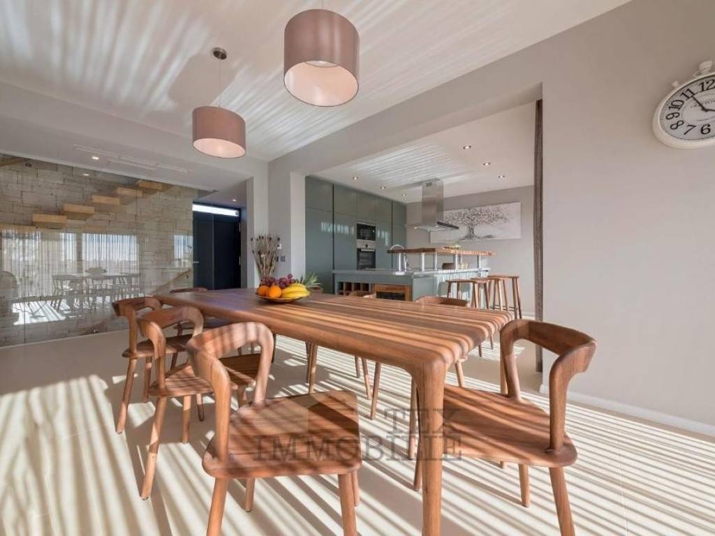 The ground floor features a spacious open-plan living room with a kitchen and dining area, furnished with high-end designer furniture.