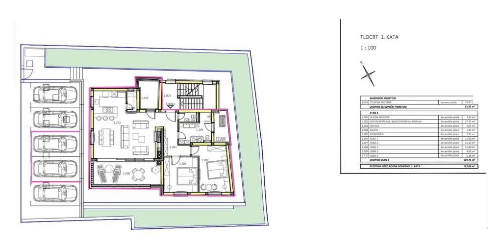 S2 Apartment on the first floor of the building with a total area of 109.59 m2 consists of an entrance area, kitchen with pantry, dining room, spacious living room (37.75 m2) with access to a loggia of 15.40 m2, two bedrooms, bathroom, toilet, and two covered loggias. The apartment includes two parking spaces. Price: €586,000.00.