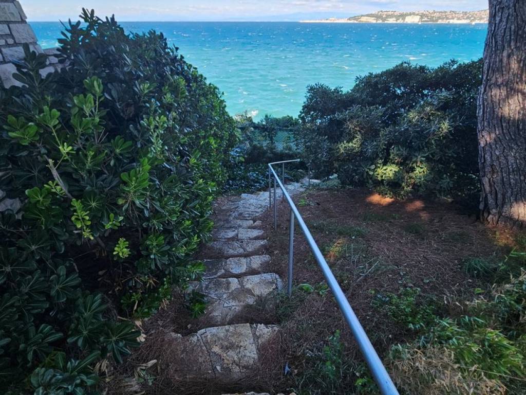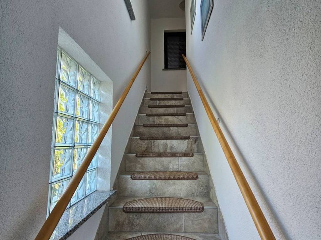 Internal stairs lead to the first floor where there is a bathroom with a walk-in shower and a bedroom with a sea view and a beautiful large loggia.