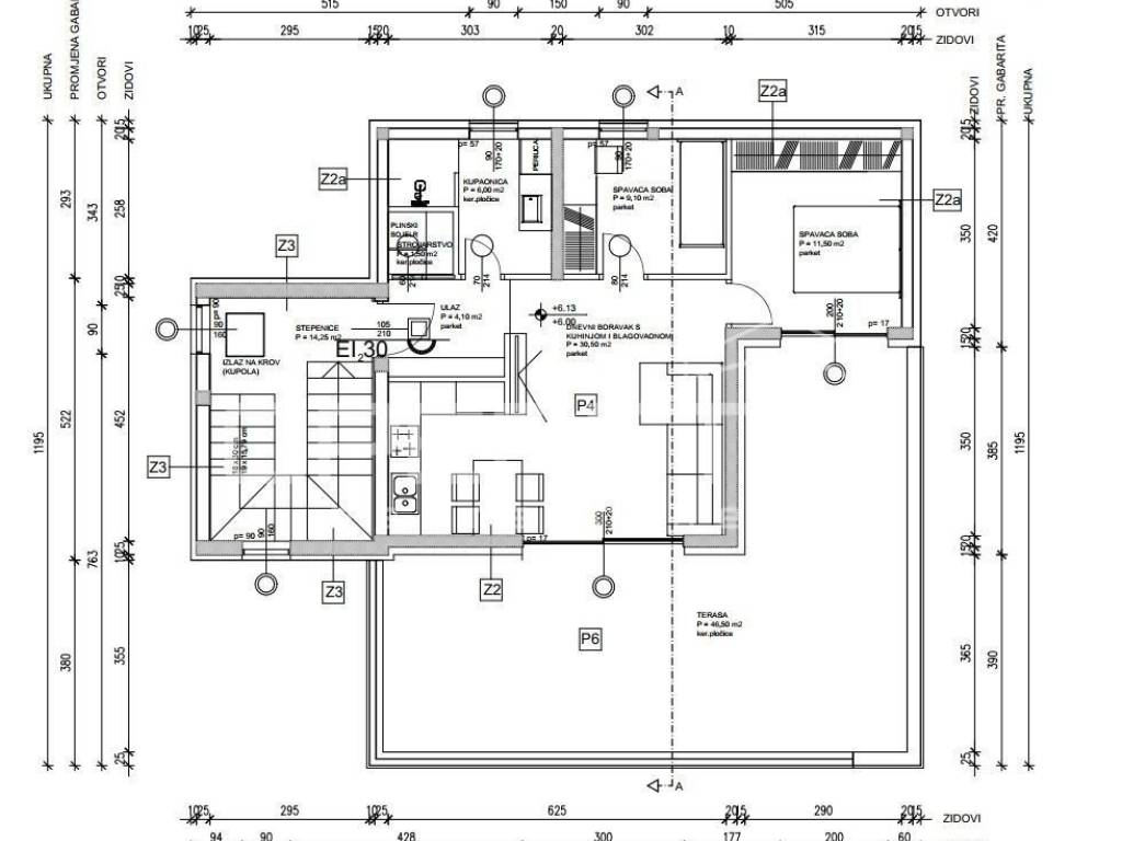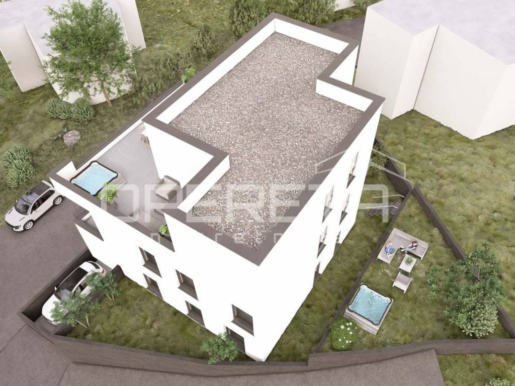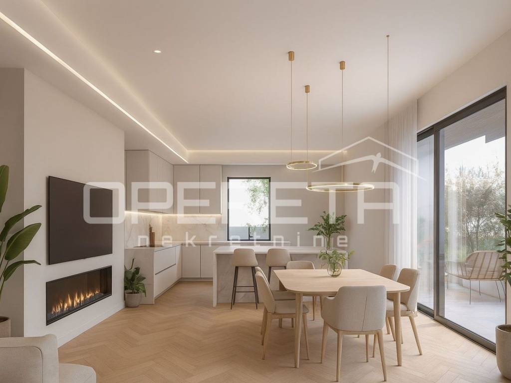Dnevni boravak i te veća spavaća soba imaju izlaz na terasu površine 47m2, sve obračunato u ukupnu kvadraturu po koeficijentima. Stan je izveden prema suvremenim standardima gradnje i opremljen podnim grijanjem, te parketom i keramikom velikih formata. PVC stolarija s troslojnim izo staklom osigurava dobru toplinsku i zvučnu izolaciju, dok sigurnosna protuprovalna vrata pružaju dodatnu razinu zaštite. Plinsko etažno grijanje omogućava individualnu regulaciju topline. Unutarnja stolarija izvedena je u modernom dizajnu, a ukupna oprema omogućuje visoku razinu funkcionalnosti i udobnosti stanovanja.