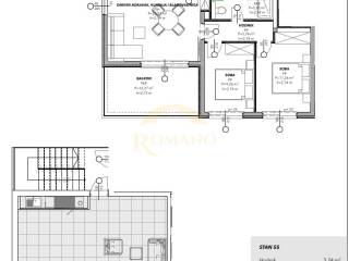 The apartment consists of a hallway, two bedrooms, bathroom with toilet, living room with kitchen and dining room with access to a covered terrace. External stairs provide access to the roof terrace that belongs to the apartment but has an area of 60 m2.