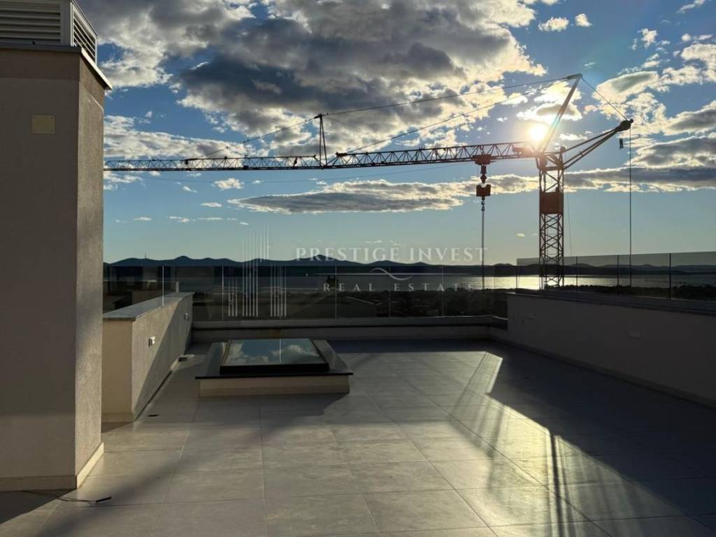 The apartment is located in a modern building with an elevator, and the large roof terrace offers an extraordinary panoramic view of the sea.