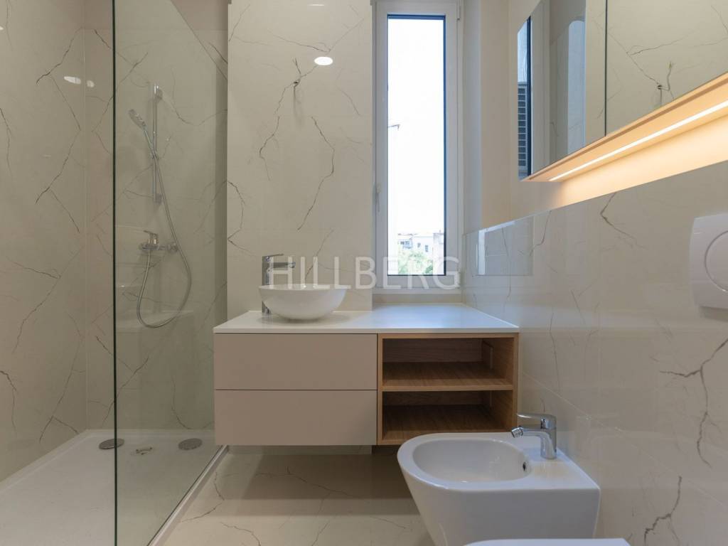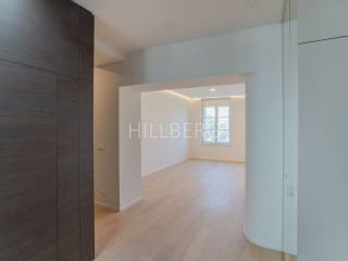 The apartment is equipped with gas central heating, underfloor heating in bathrooms, and air conditioning in every room. It is offered partially furnished, with the option of further furnishing by arrangement.