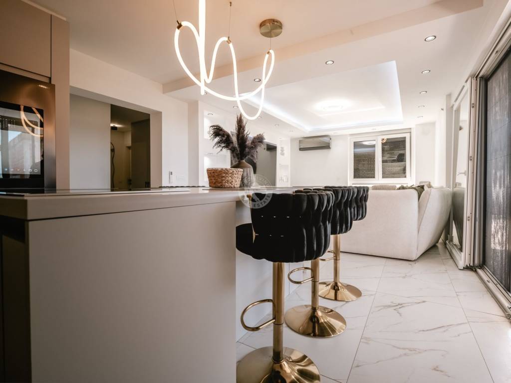 The apartment is located on the ground floor of a newer residential building and offers a spacious living area of 78 m2, with two bedrooms, a bright living room with a modern kitchen and island, and a dining area with direct access to the terrace.