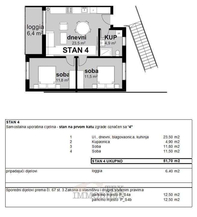 The apartment is part of a building with a total of four residential units and consists of an entrance hallway, an open-plan living space with a kitchen, dining area, and living room with access to a 6.4 m² loggia, two bedrooms, and one bathroom.