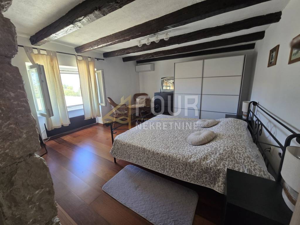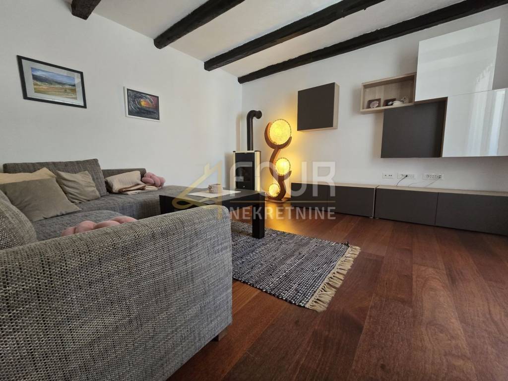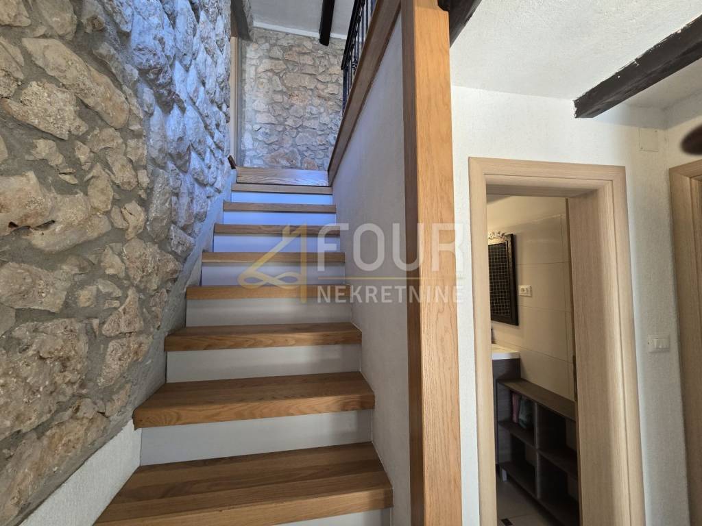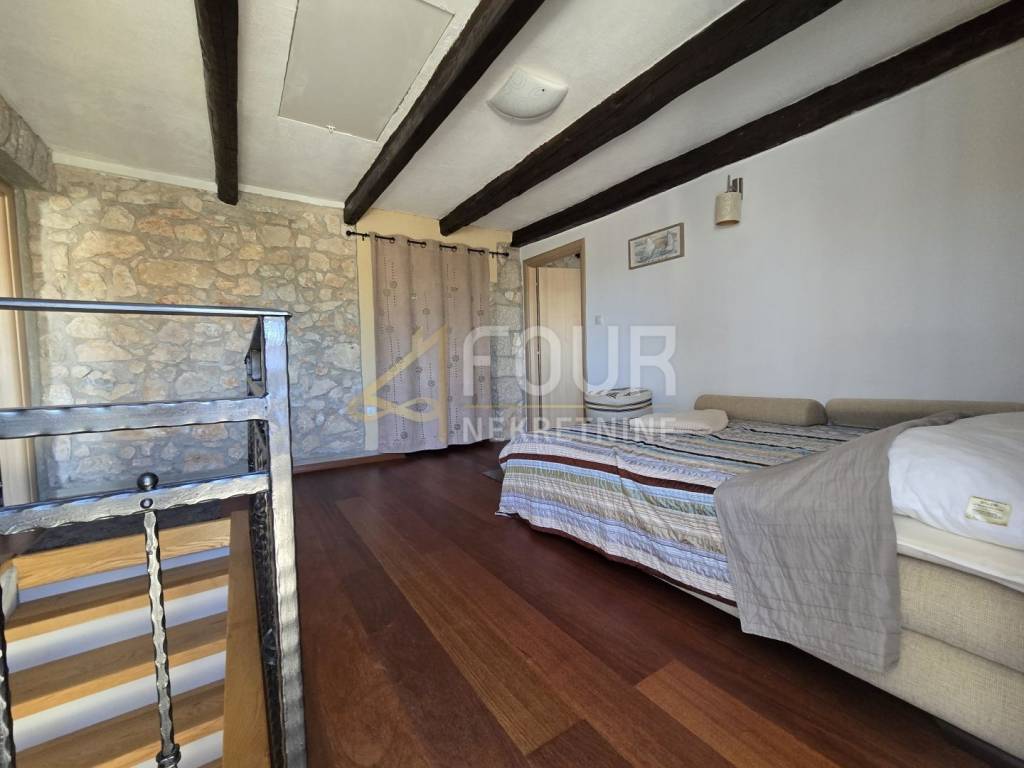 A beautiful semi-detached stone house for sale in a peaceful location in the village of Kras on the island of Krk. The house has been completely renovated, categorized, and is being sold fully furnished. It spreads over two floors with a total living area of 202 m2 and is situated on a plot of 277 m² with a landscaped yard of 176 m².