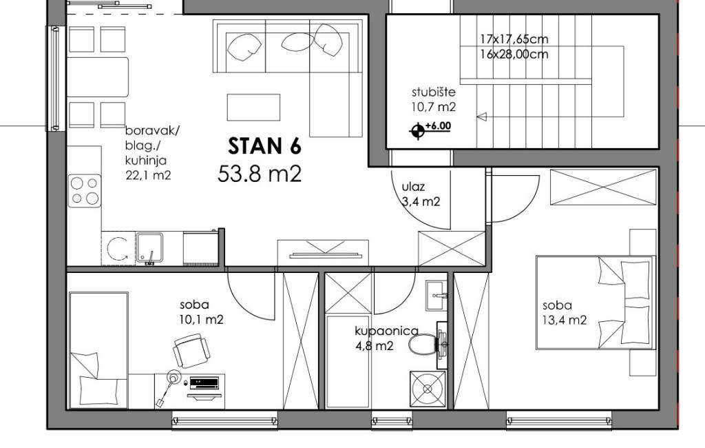Trosoban stan zatvorene površine 53,80 m2 smješten na 2. katu.