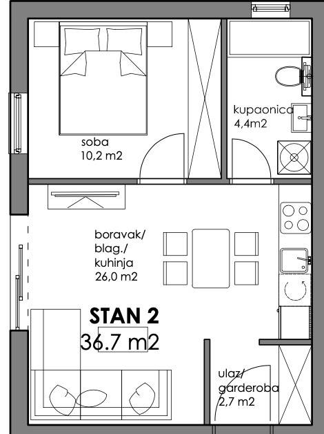 Sastoji se od ulaza/garderobe, dnevnog boravka, kuhinje s blagovaonicom, kupaonice te spavaće sobe.