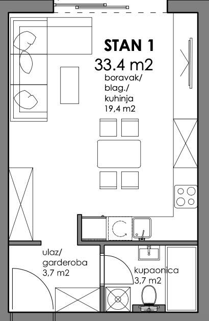 Jednosoban stan površine 33,40 m2 smješten u prizemlju.Sastoji se od ulaza/garderobe, dnevnog boravka, kuhinje s blagovaonicom te kupaonice.Uz stan je obavezna kupnja i spremišta te parkirnog mjesta.-----Projekt suvremene stambene novogradnje izvedene u armirano-betonskoj konstrukciji s monolitnim međukatnim pločama. Pregradni zidovi izrađeni su po Knauf sustavu s ispunom od mineralne vune, a zidovi između stanova dodatno su toplinski i zvučno izolirani. Objekt je projektiran s ravnim, neprohodnim krovom u višeslojnoj izvedbi te ETICS fasadom s mineralnom vunom i stiroporom debljine 15 cm i završnim slojem silikatne žbuke.