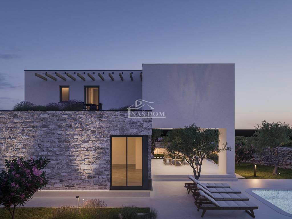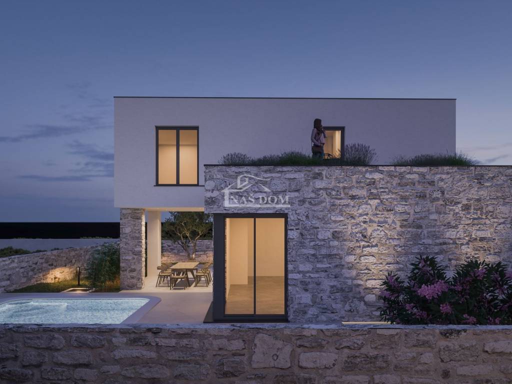 Zaton - a luxury urban villa with a swimming pool is for sale in a quiet location. The house has a gross area of 171.20 m² (net living area 141.6 m²) and consists of two floors: ground floor + first floor. On the ground floor there is an entrance, hallway, bedroom, bathroom, open space kitchen with dining area, and living room with access to a partially covered terrace and garden. The ground floor also includes a technical room and additional storage/pantry. An internal staircase leads to the first floor of the house, where there is a corridor, two bedrooms, a bathroom, a master bedroom with its own bathroom, and a terrace.