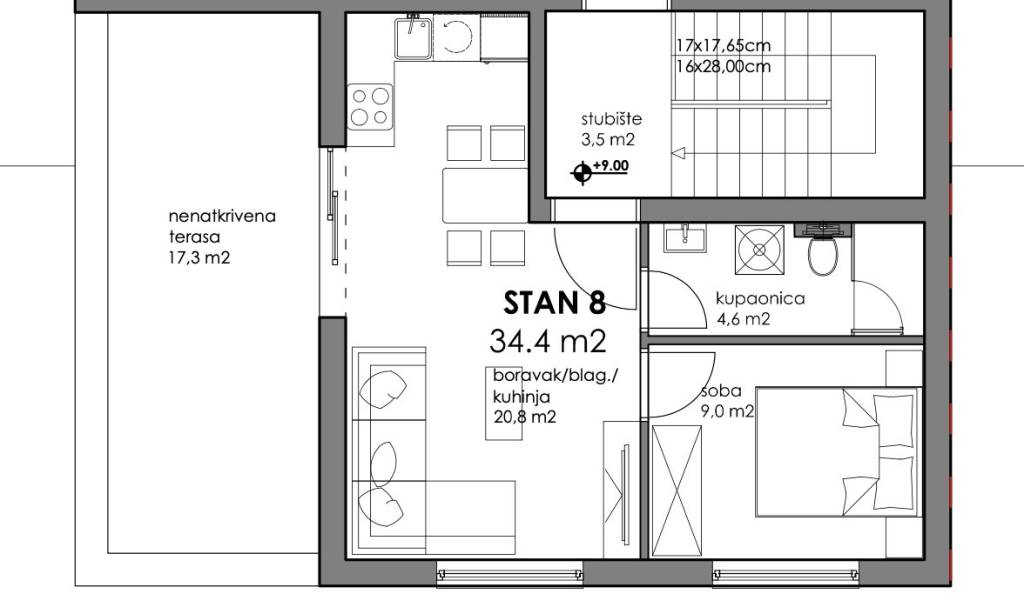 Sastoji se od dnevnog boravka, kuhinje s blagovaonicom, nenatkrivene terase, spavaće sobe te kupaonice.Uz stan je obavezna kupnja i spremišta te parkirnog mjesta.-----Projekt suvremene stambene novogradnje izvedene u armirano-betonskoj konstrukciji s monolitnim međukatnim pločama. Pregradni zidovi izrađeni su po Knauf sustavu s ispunom od mineralne vune, a zidovi između stanova dodatno su toplinski i zvučno izolirani. Objekt je projektiran s ravnim, neprohodnim krovom u višeslojnoj izvedbi te ETICS fasadom s mineralnom vunom i stiroporom debljine 15 cm i završnim slojem silikatne žbuke.