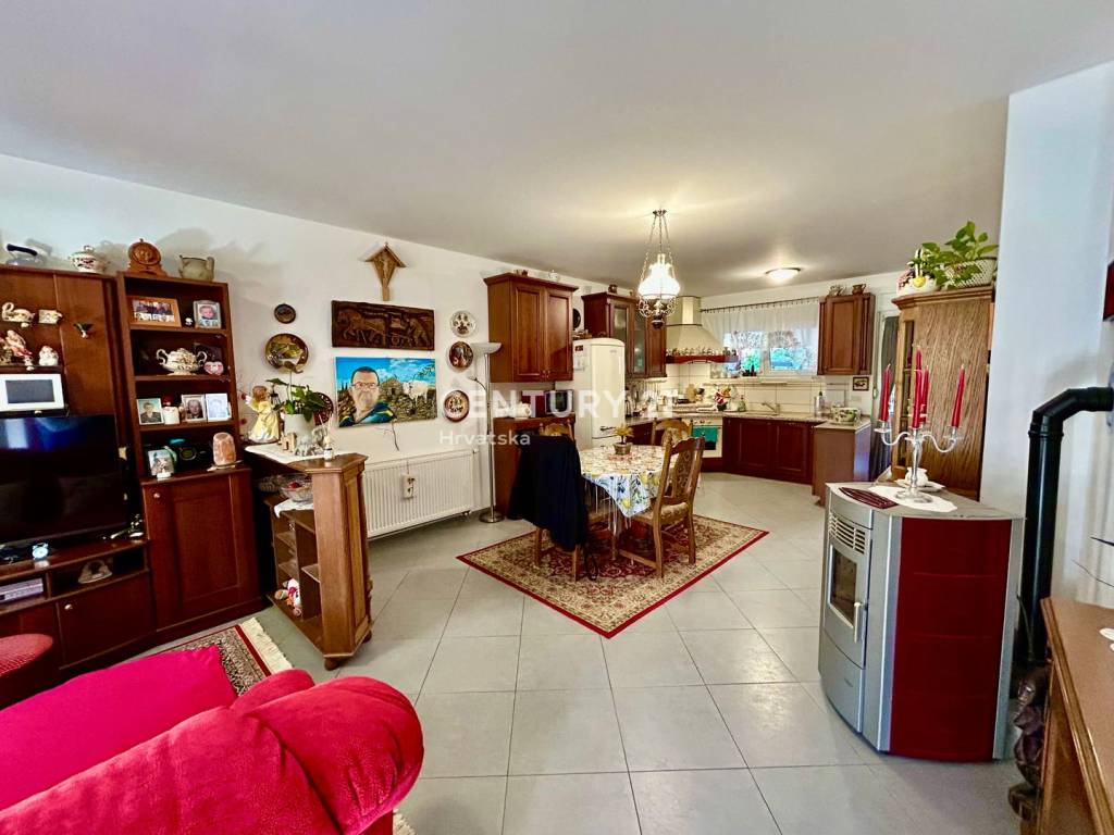 The interior of the house is equipped with a modern kitchen with appliances, dishwasher, and washing machine, contributing to everyday comfort. The living room is complemented by a pellet stove, while the rooms are furnished with beds, a desk, and a TV. The bathroom is equipped with a shower cabin, and smart home technology and video surveillance further enhance the level of security and convenience.