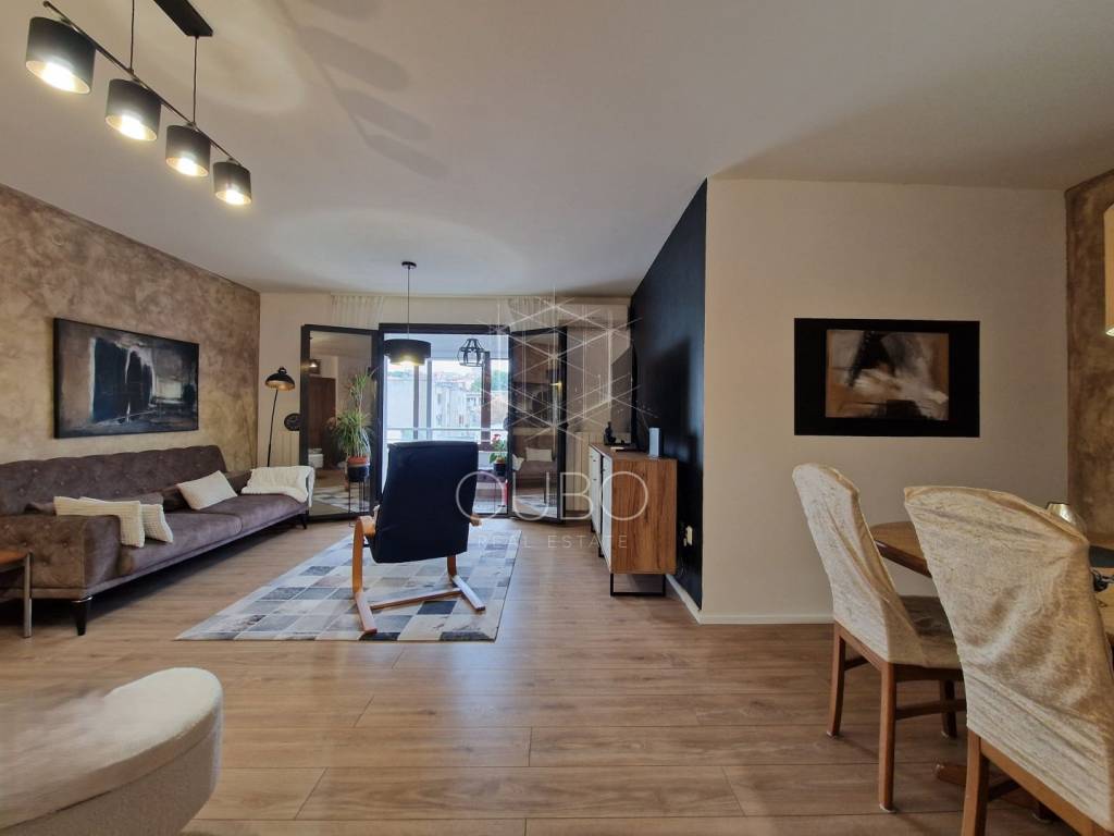 The living and dining area form a single harmonious unit, while the kitchen is elegantly separated by a glass wall, allowing light to flow freely through the interior. A closed loggia offers a peaceful corner for coffee or reading, overlooking the quieter side of the city.